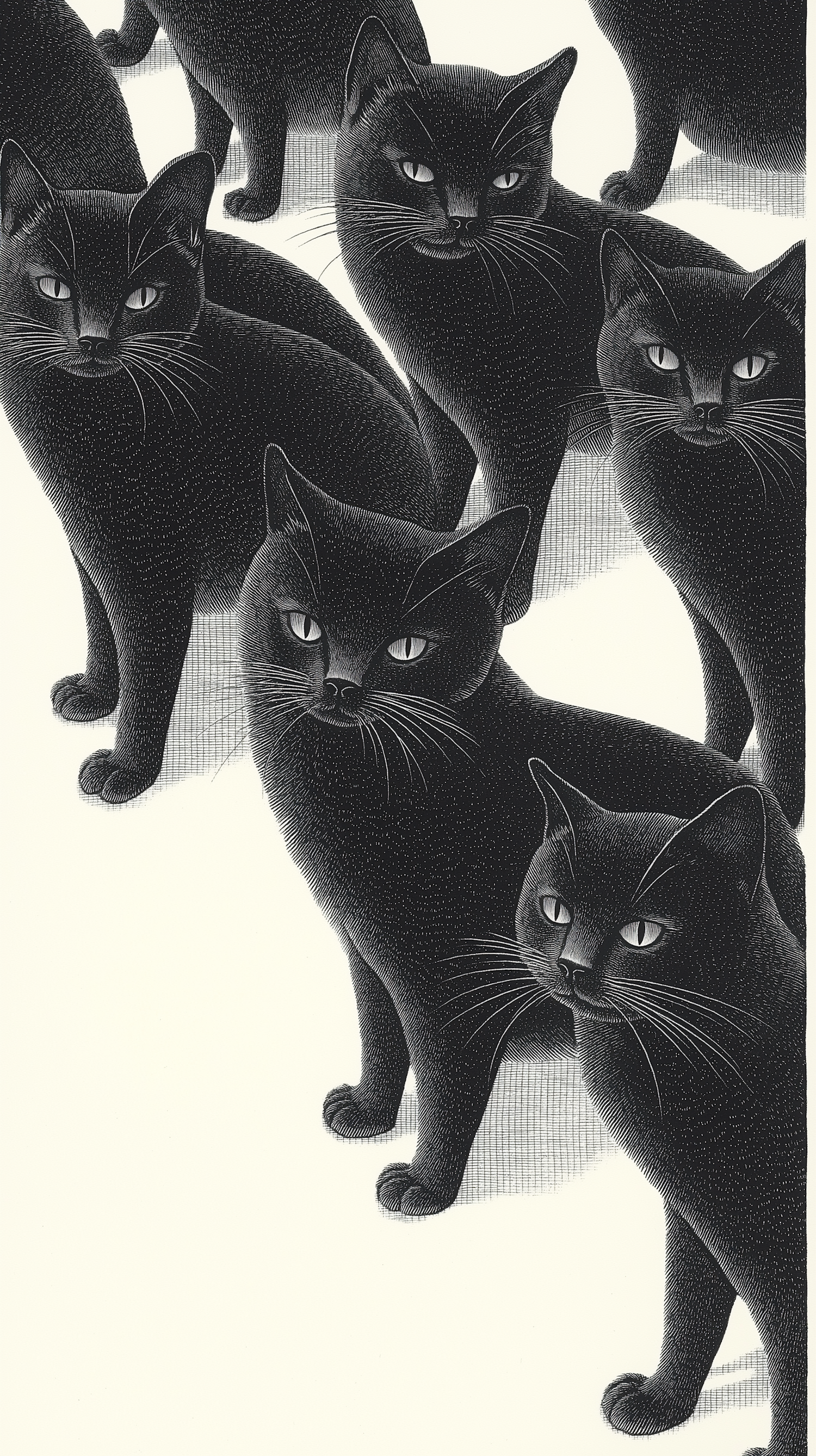 Stylized illustration of multiple black cats with detailed line work, creating a striking and symmetrical pattern.