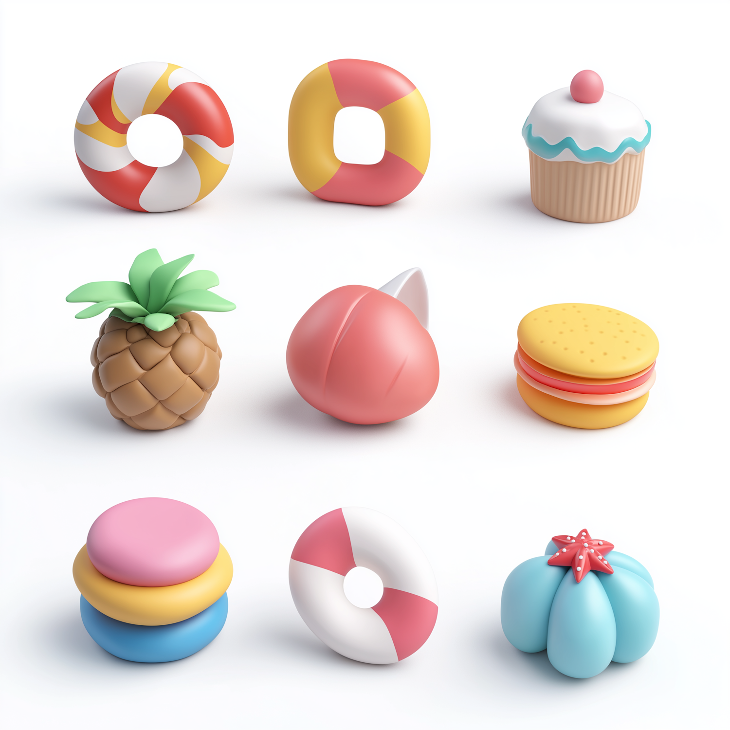 Playful 3D objects including donuts, macarons, a cupcake, and a pineapple in vibrant colors on a white background.