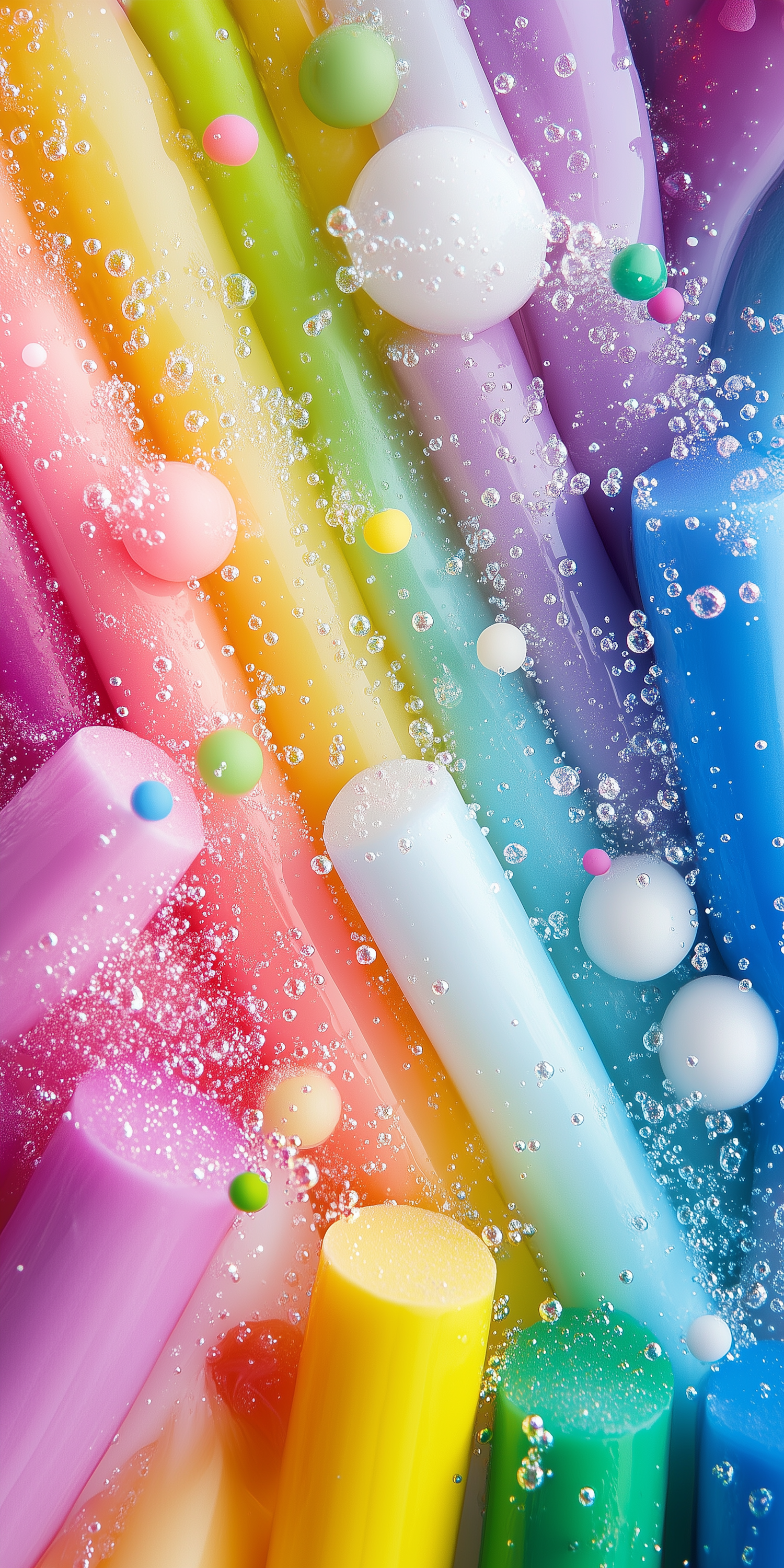 Bright abstract art with rainbow cylinders, pastel spheres, and bubbles creating a playful, colorful, and dynamic visual effect.