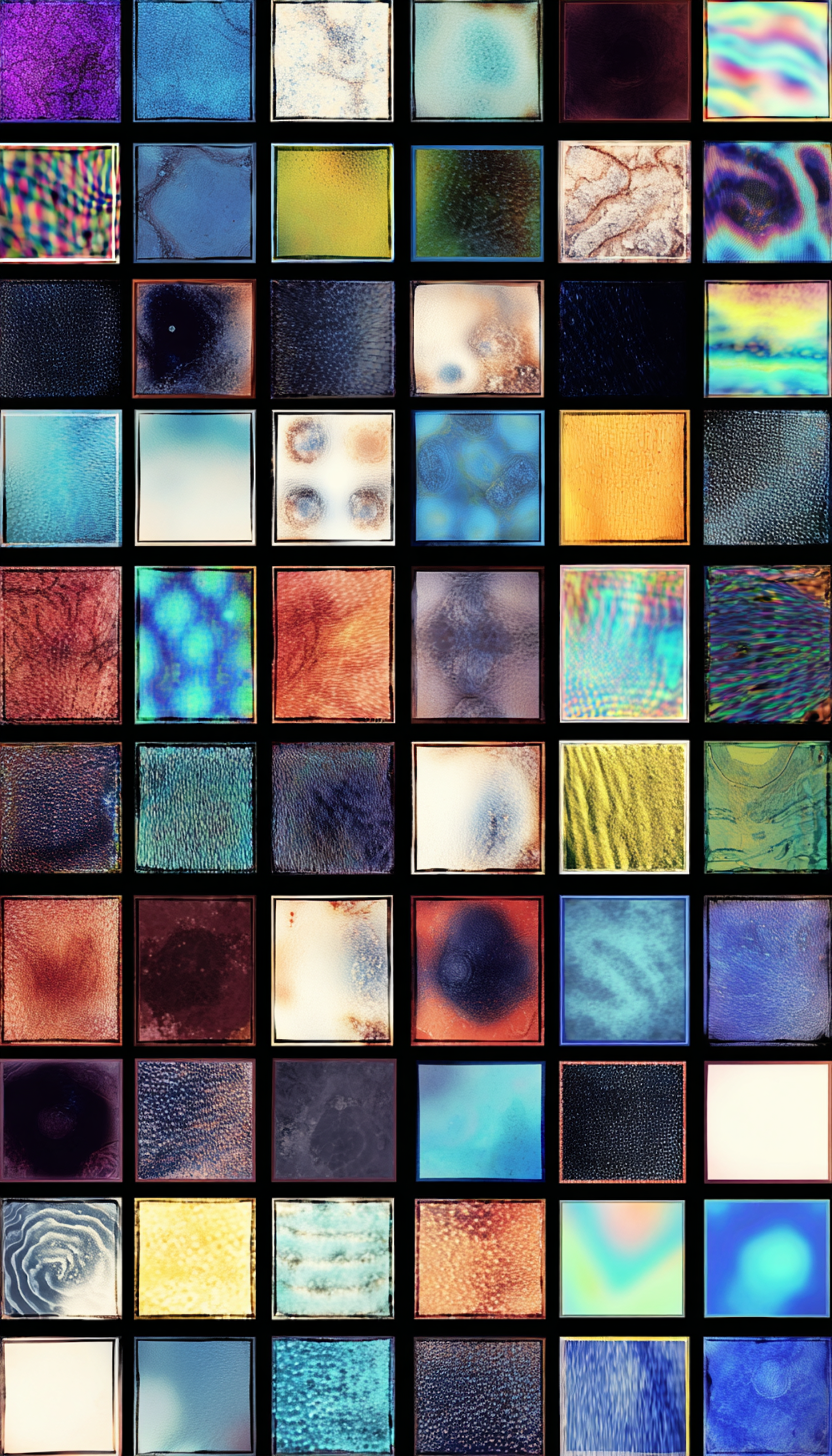 A vibrant grid of abstract textures and colors, each square showcasing unique patterns and hues, perfect for creative inspiration.