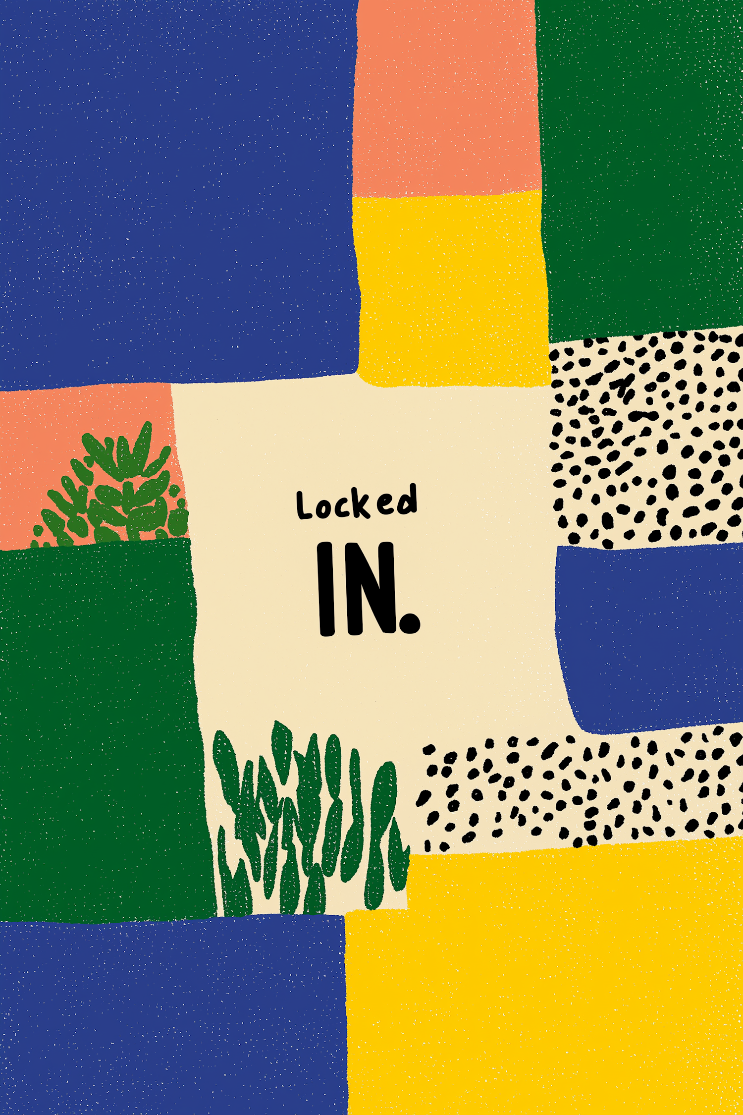 Colorful abstract illustration with bold text 'Locked IN.' amidst vibrant blocks and patterns in blue, yellow, green, and peach.