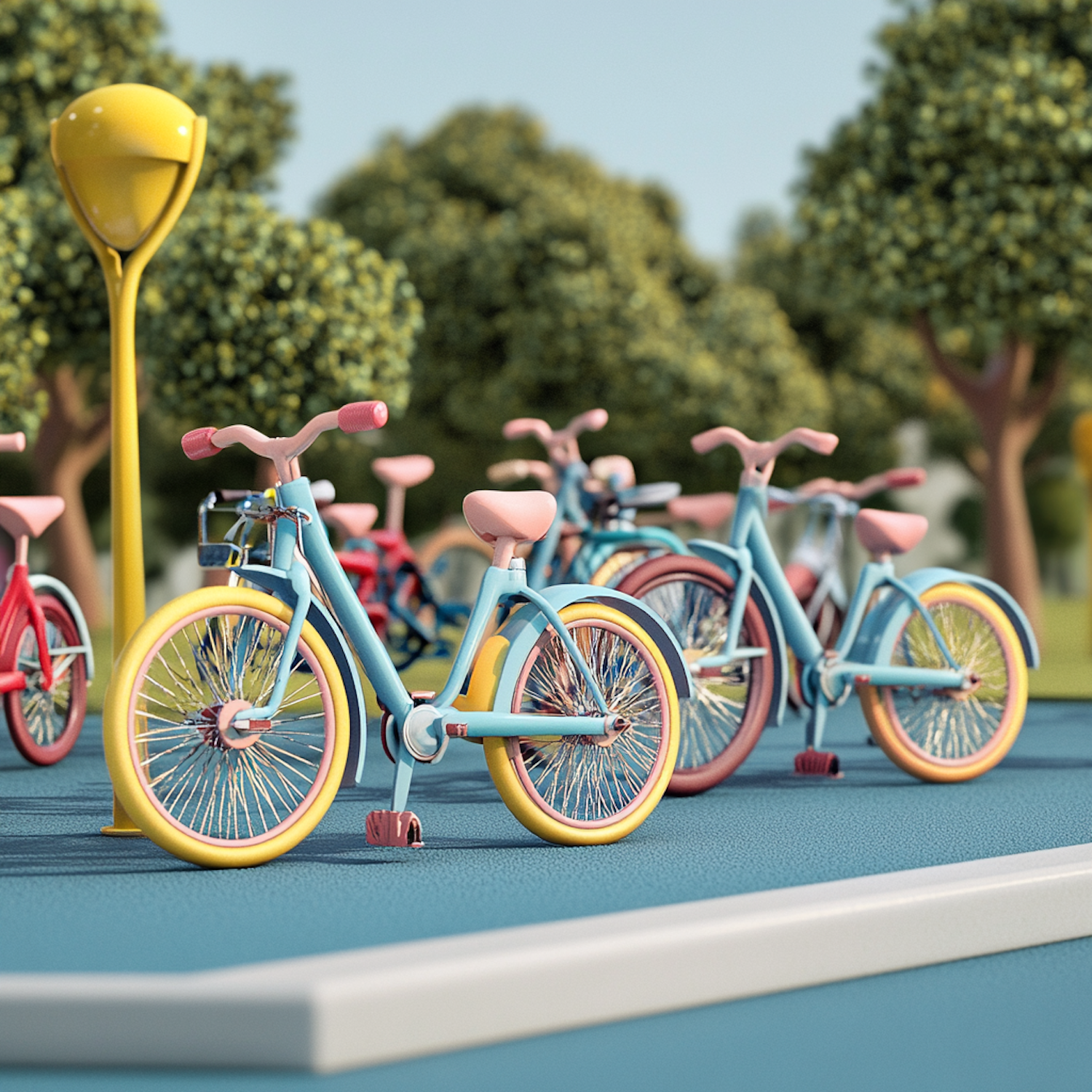 Colorful pastel bicycles parked on a blue surface with lush green trees and a yellow lamp post in a serene park setting.