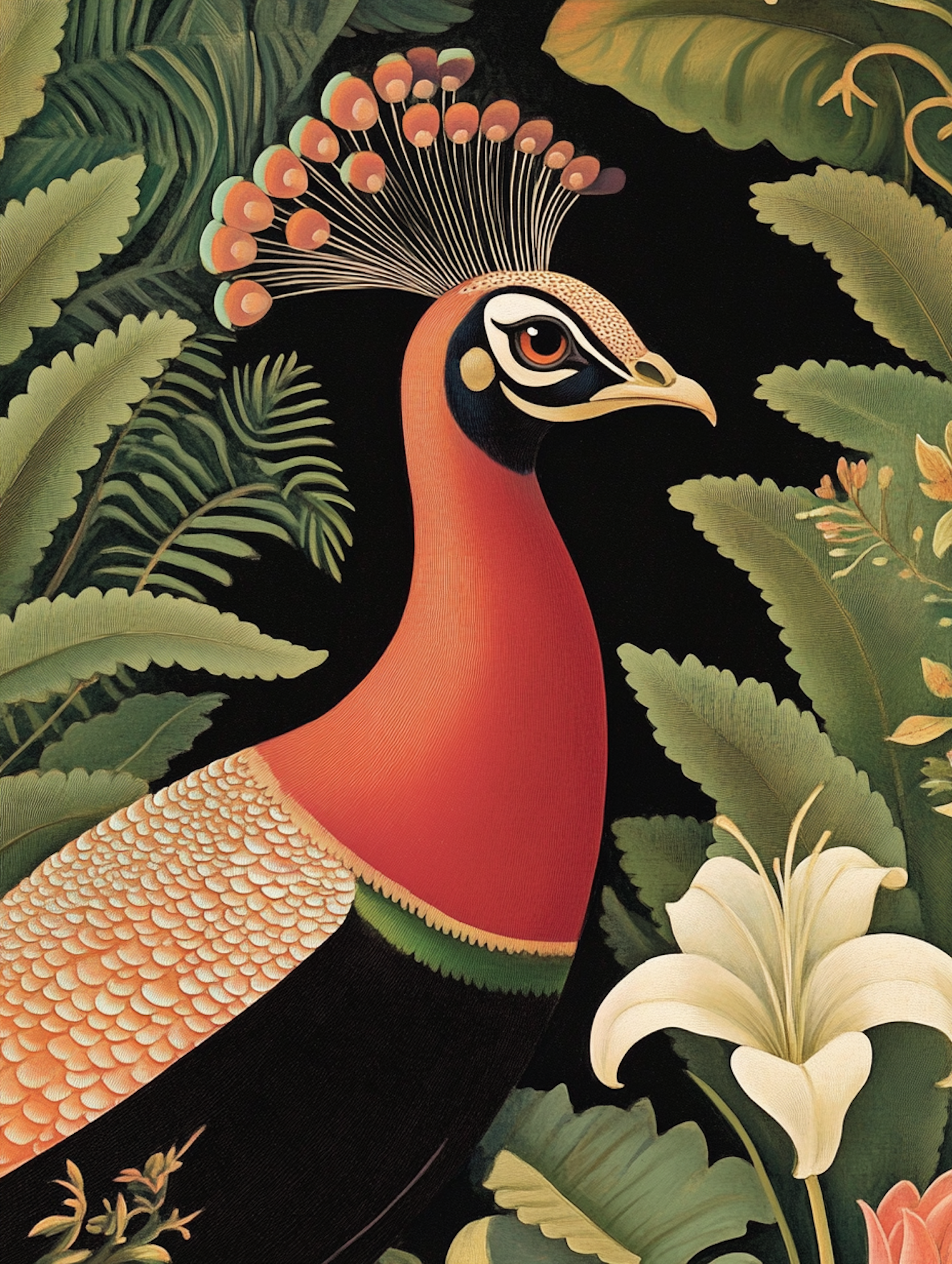 Stylized illustration of a vibrant bird with a red neck, ornate crest, and tropical foliage, featuring lush green leaves and a white lily.