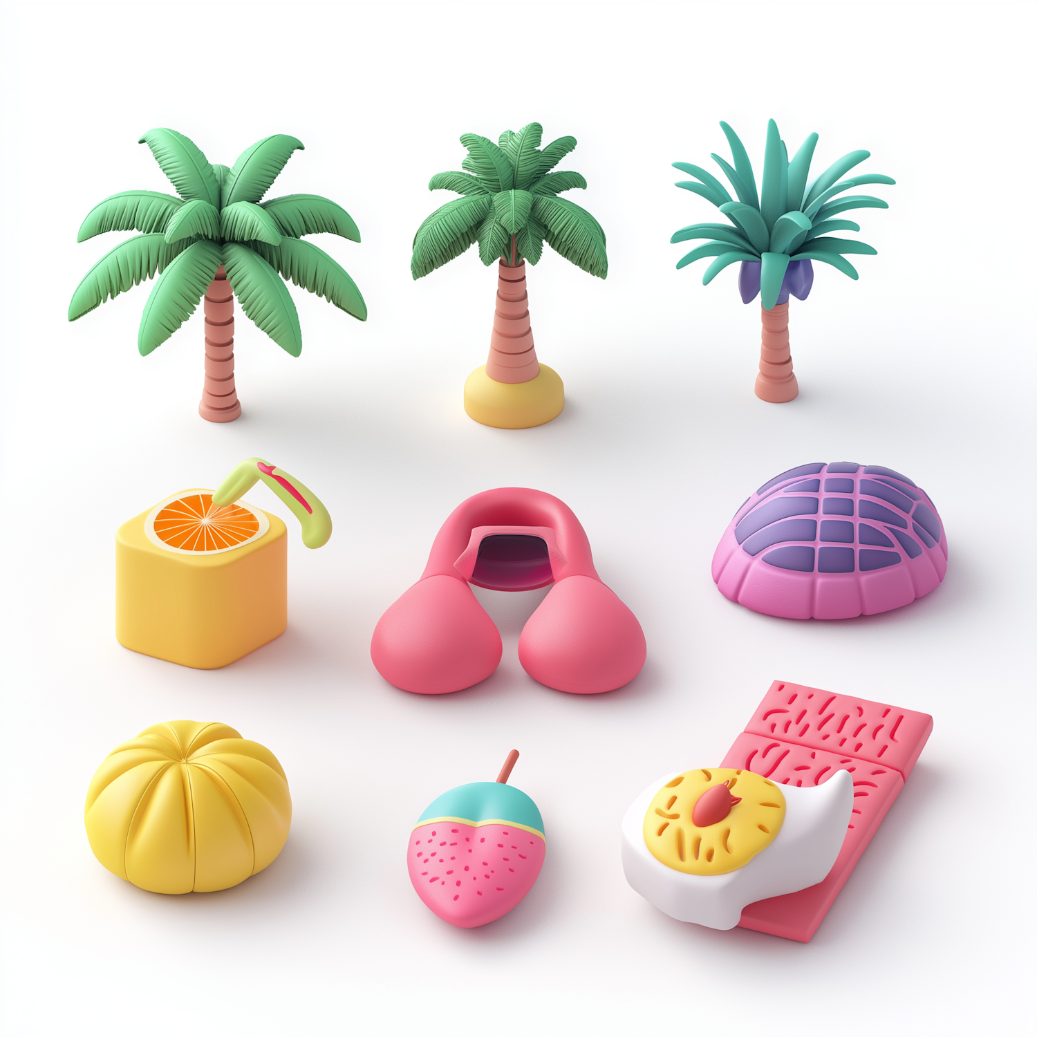 Playful 3D cartoon objects including palm trees, fruits, and abstract shapes in vibrant colors on a white background.