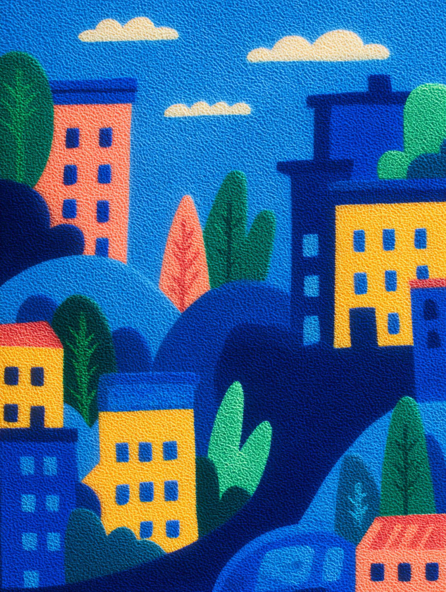 Colorful cityscape illustration with vibrant buildings, lush greenery, and a bright blue sky with clouds, creating a cheerful atmosphere.
