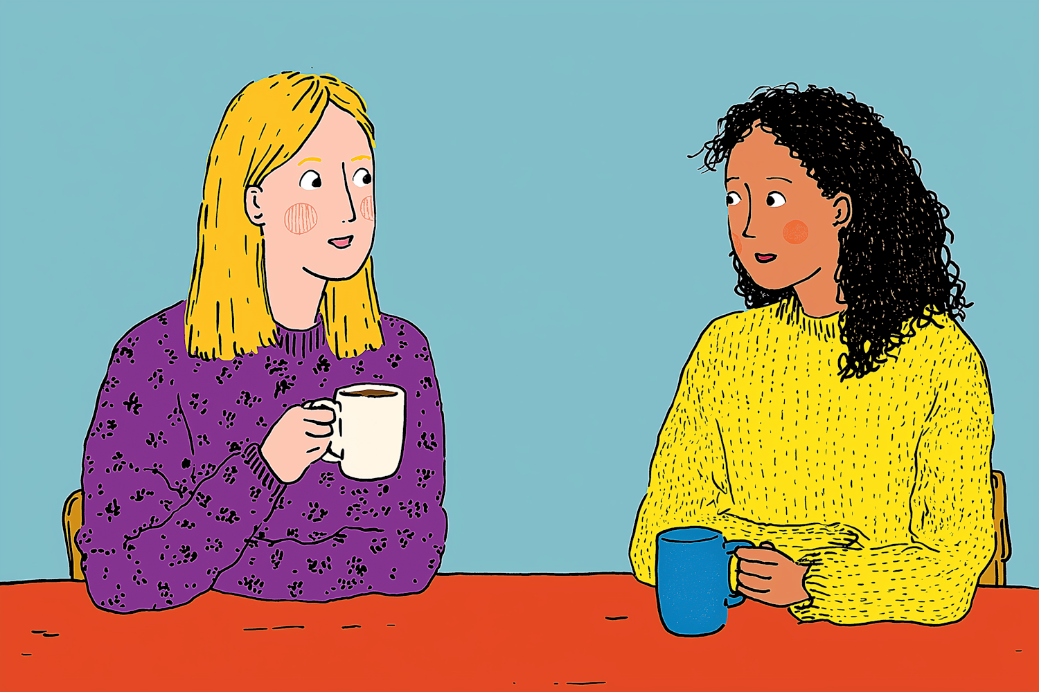 Illustration of two people conversing over coffee, one in a purple sweater and the other in yellow, set against a light blue background.