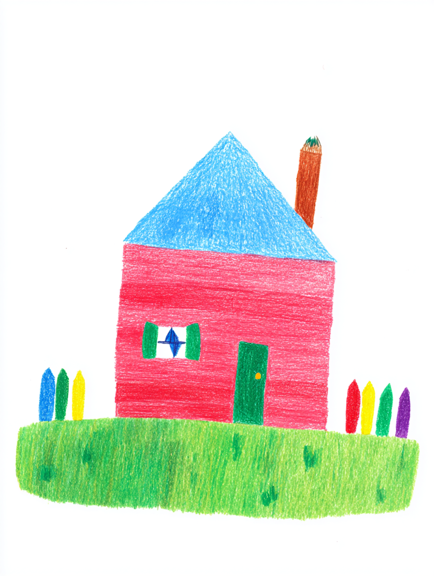 A vibrant crayon drawing of a red house with a blue roof, colorful picket fence, and green lawn, showcasing a cheerful and playful design.