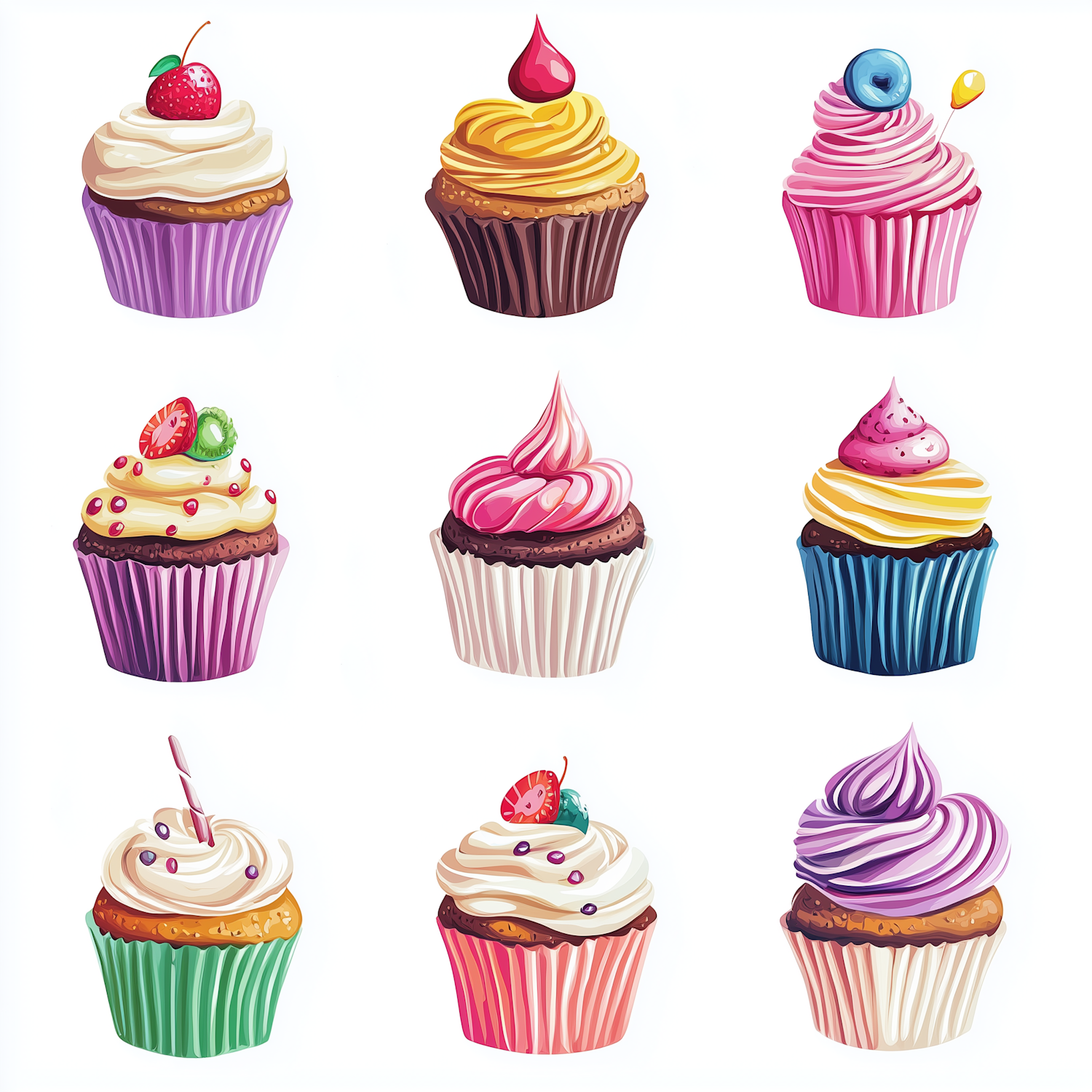 Colorful cupcakes with unique frosting designs and toppings, perfect for dessert lovers or party inspiration.