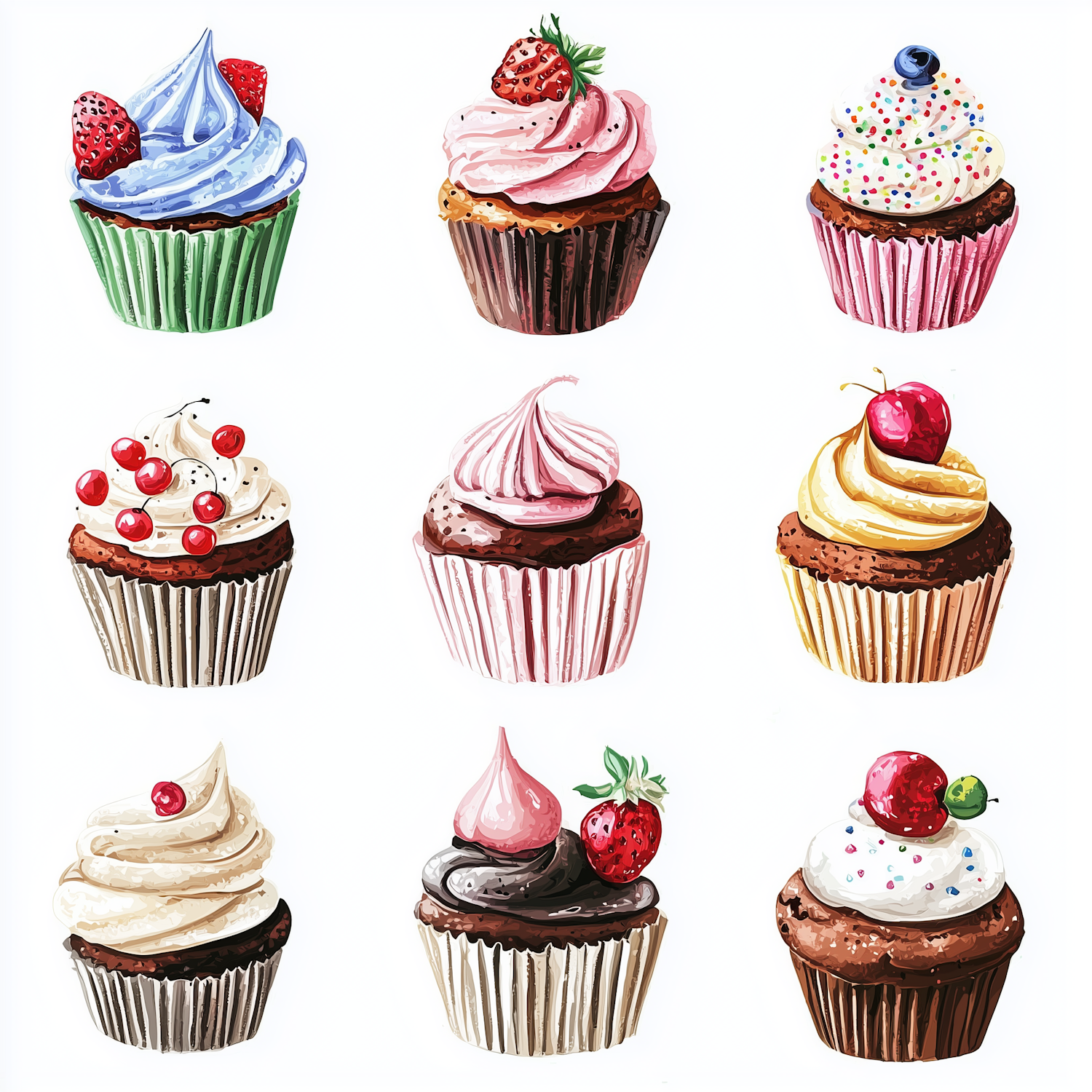 A colorful illustration of nine uniquely decorated cupcakes with vibrant frosting and toppings like berries, sprinkles, and cherries.