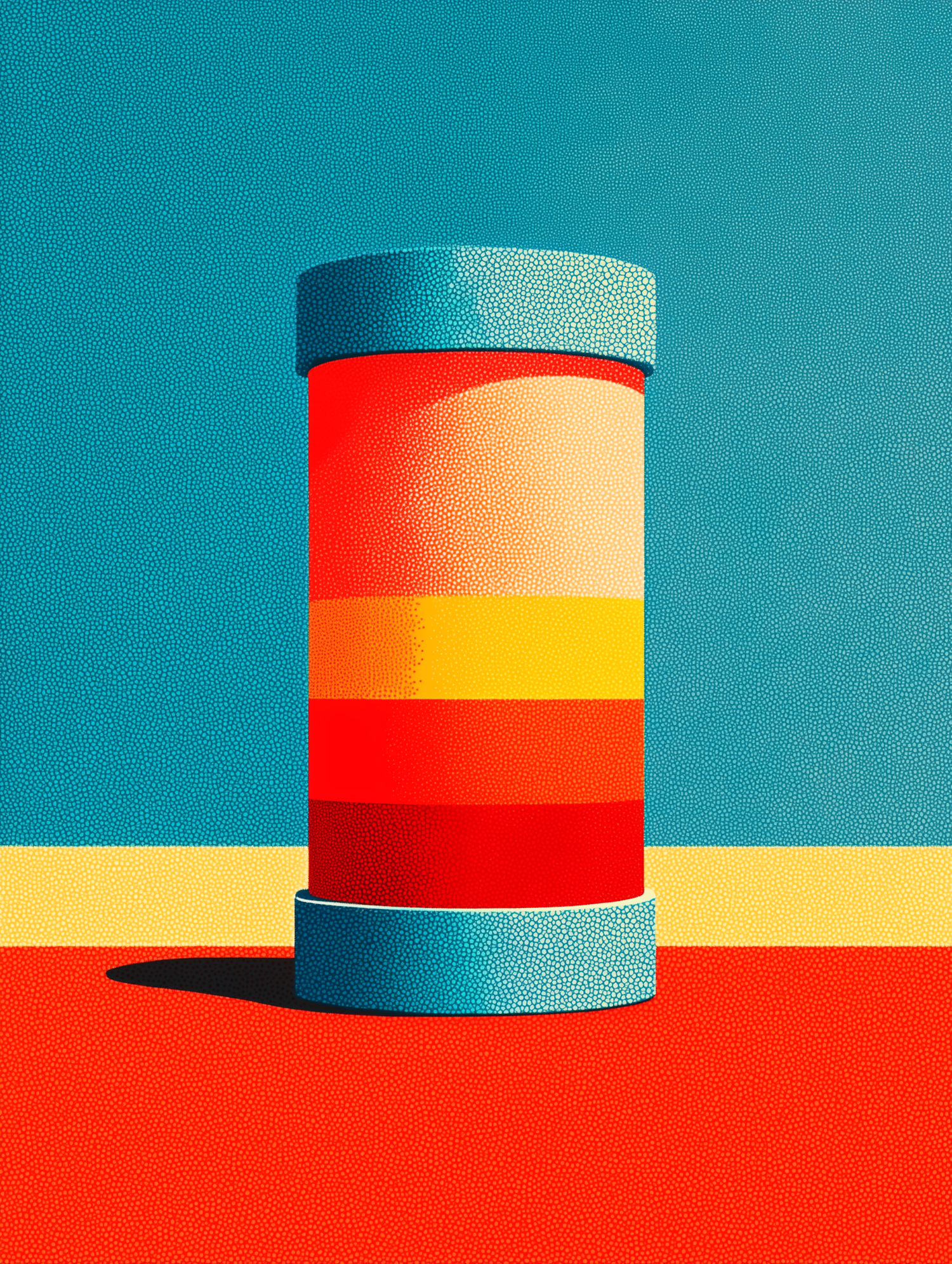 Colorful cylindrical object with vibrant horizontal bands on a textured background, blending blue, red, and yellow tones.