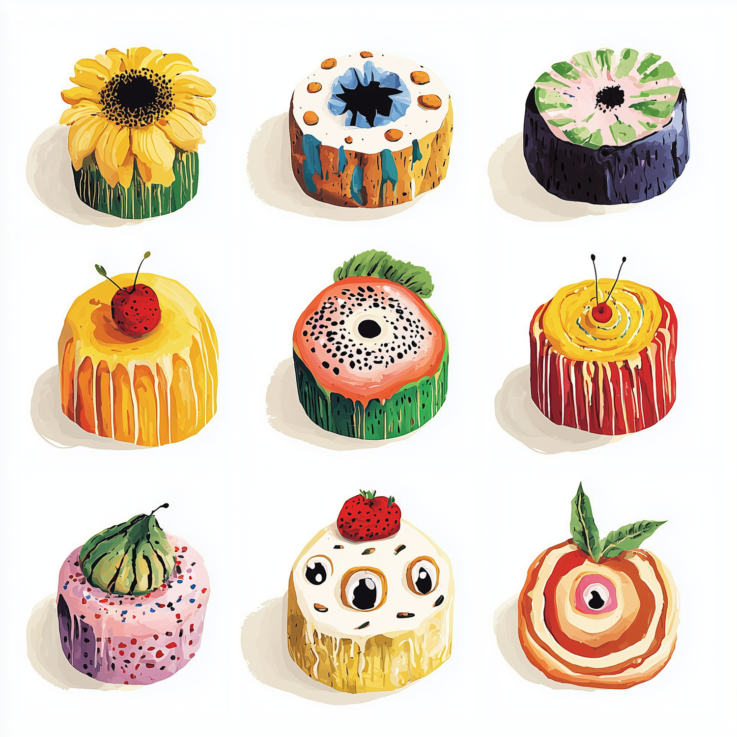Whimsical desserts inspired by fruits, flowers, and abstract designs, bursting with vibrant colors and creative details.
