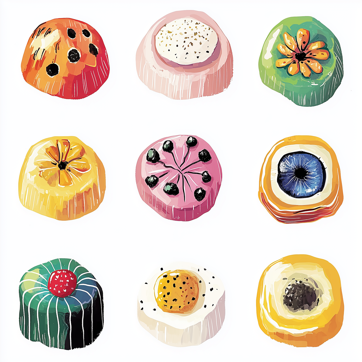 Brightly illustrated desserts in a 3x3 grid, each uniquely designed with vibrant colors and intricate patterns. Perfect for food art lovers!