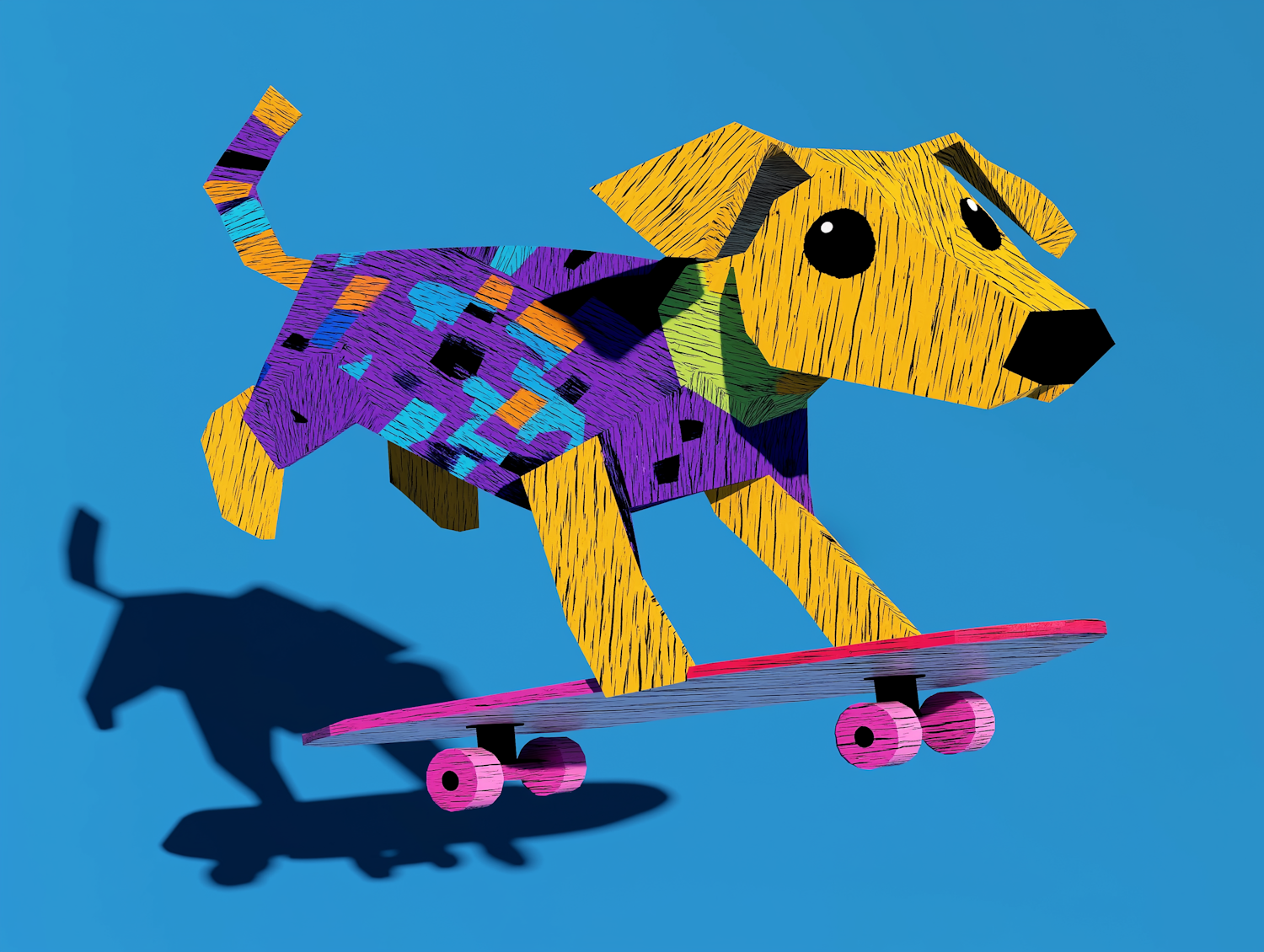 Colorful illustration of a playful dog skateboarding on a pink board against a bright blue background.