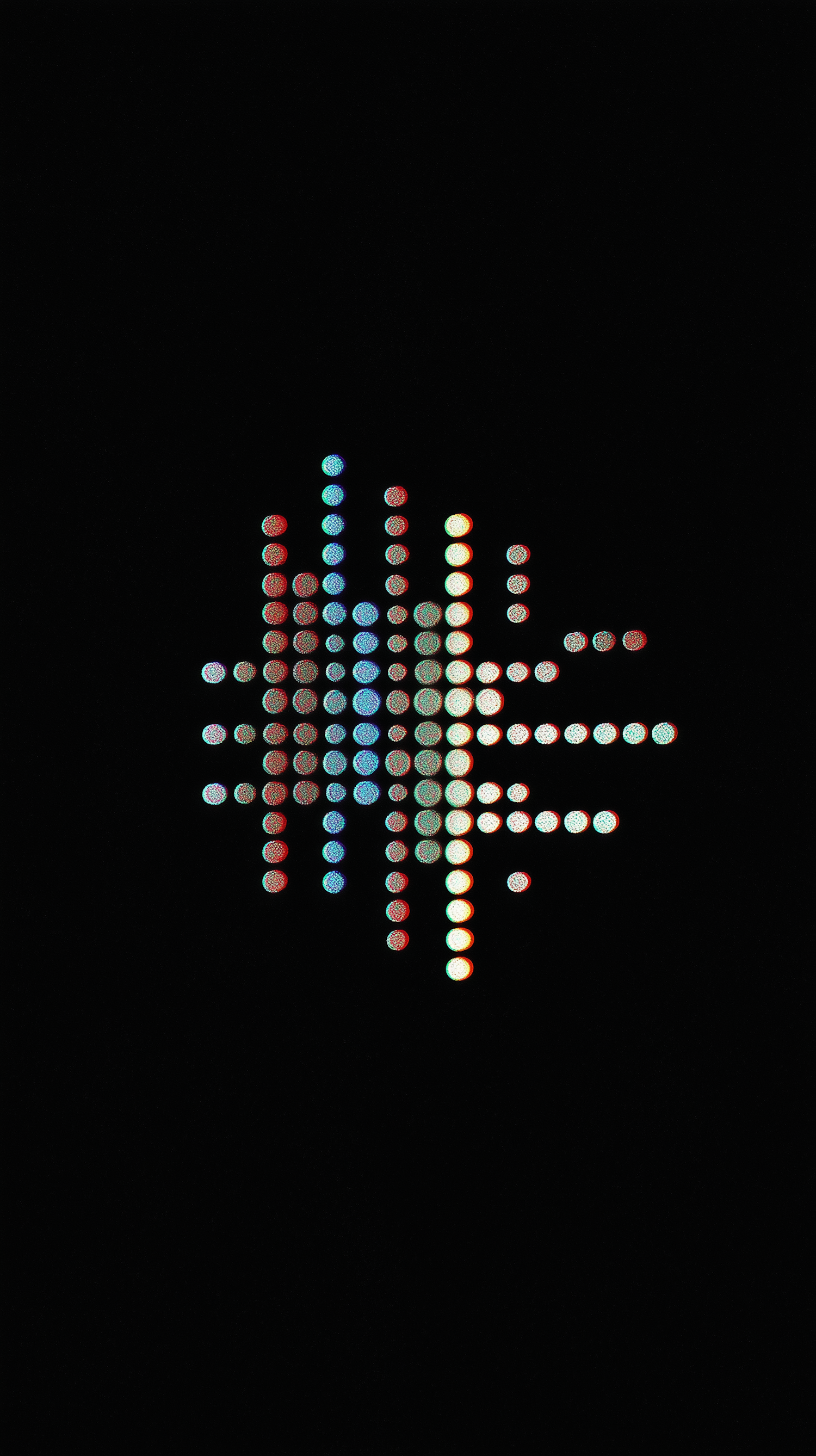 Minimalist digital art with colorful glowing dots forming a soundwave-like pattern on a black background. Vibrant and modern design.
