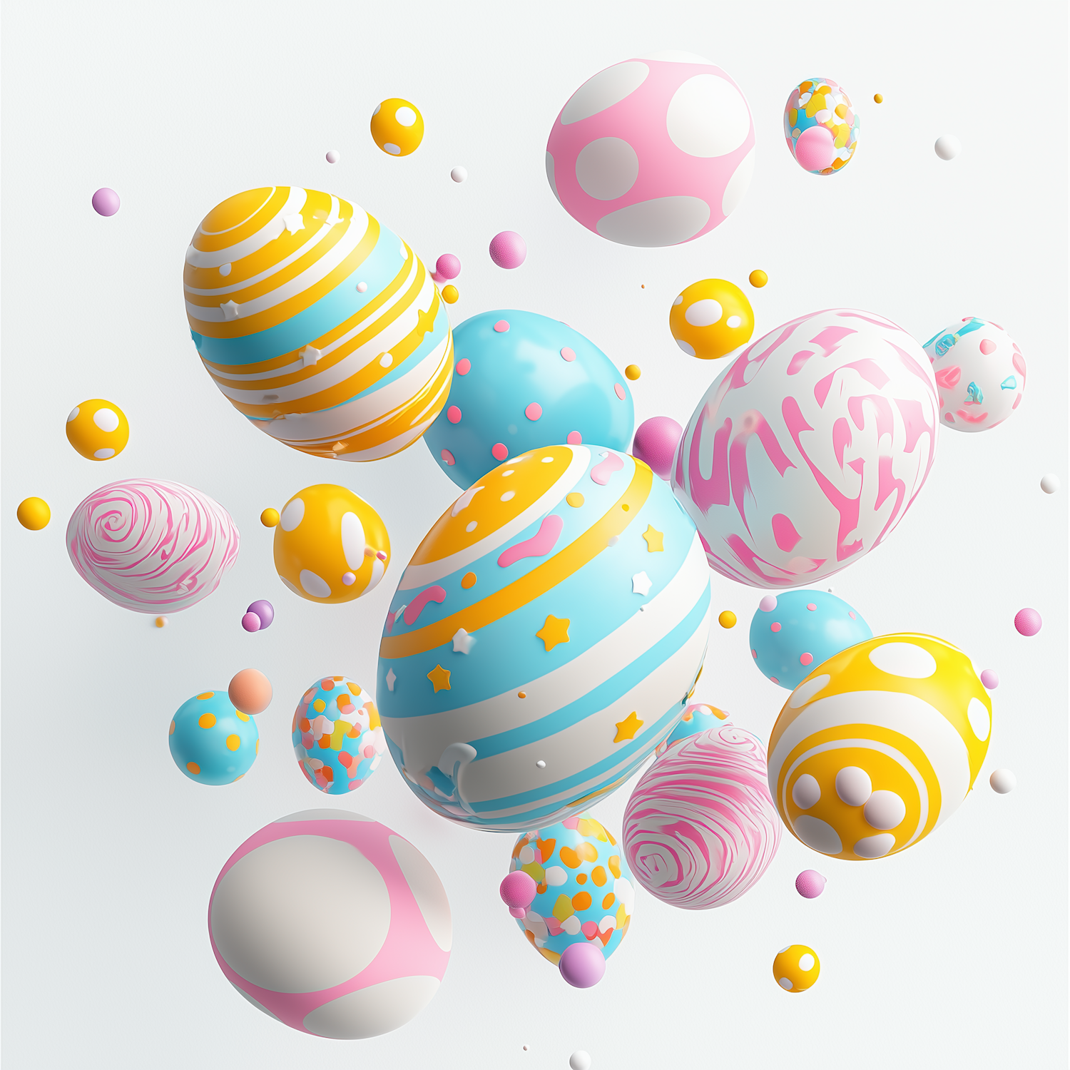 Floating pastel Easter eggs with stripes, dots, and stars in pink, blue, and yellow hues. A cheerful and festive design!