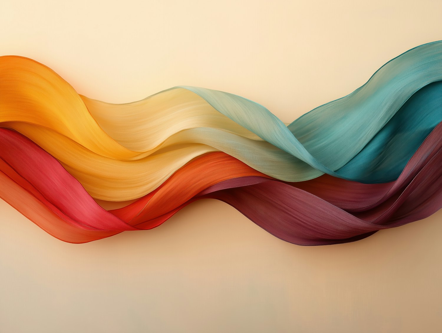 Flowing colorful ribbons in warm and cool tones on a neutral beige background, creating a dynamic and artistic wave-like composition.