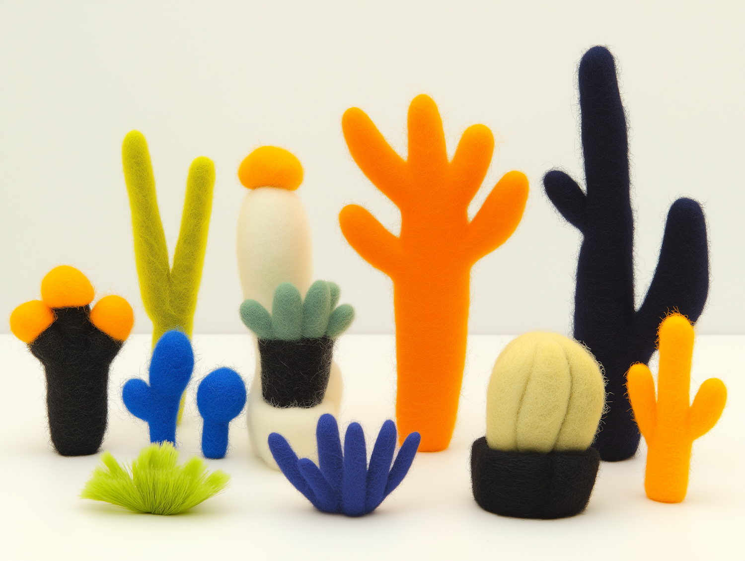 Colorful felt sculptures resembling abstract cacti in vibrant hues of orange, blue, and green on a light background.
