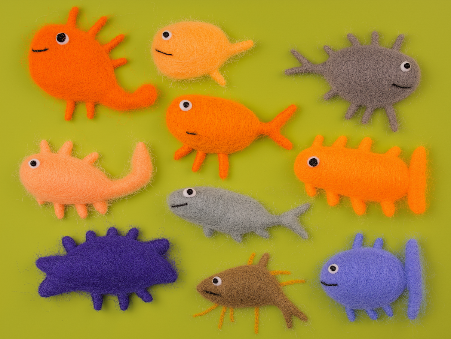 Colorful felted fish in various shapes on a green background, showcasing playful and artistic wool designs.