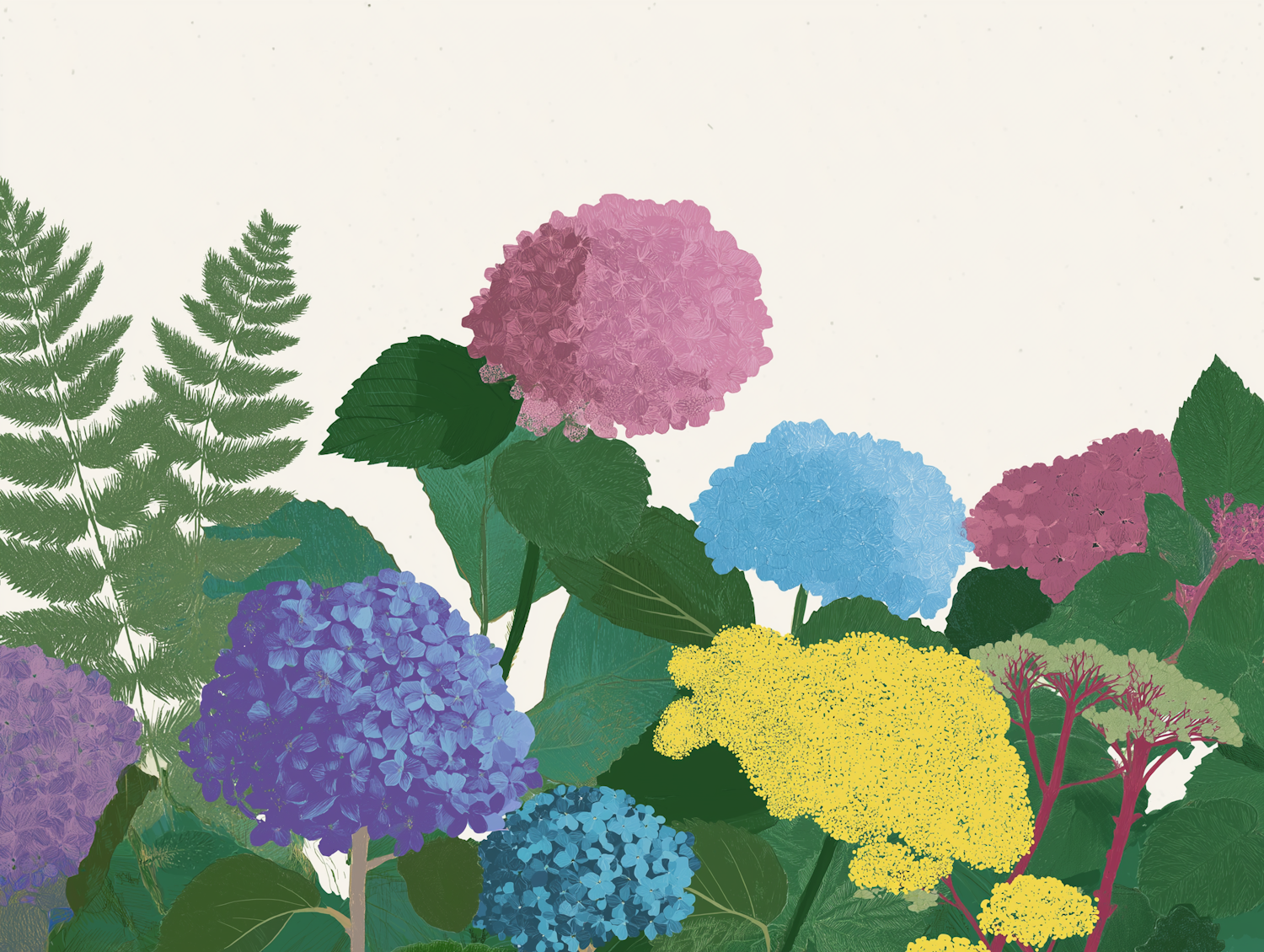 Beautiful illustration of colorful flowers and green foliage, featuring pink, blue, purple, and yellow blooms, antique hydrangea colors, against a soft white backdrop.
