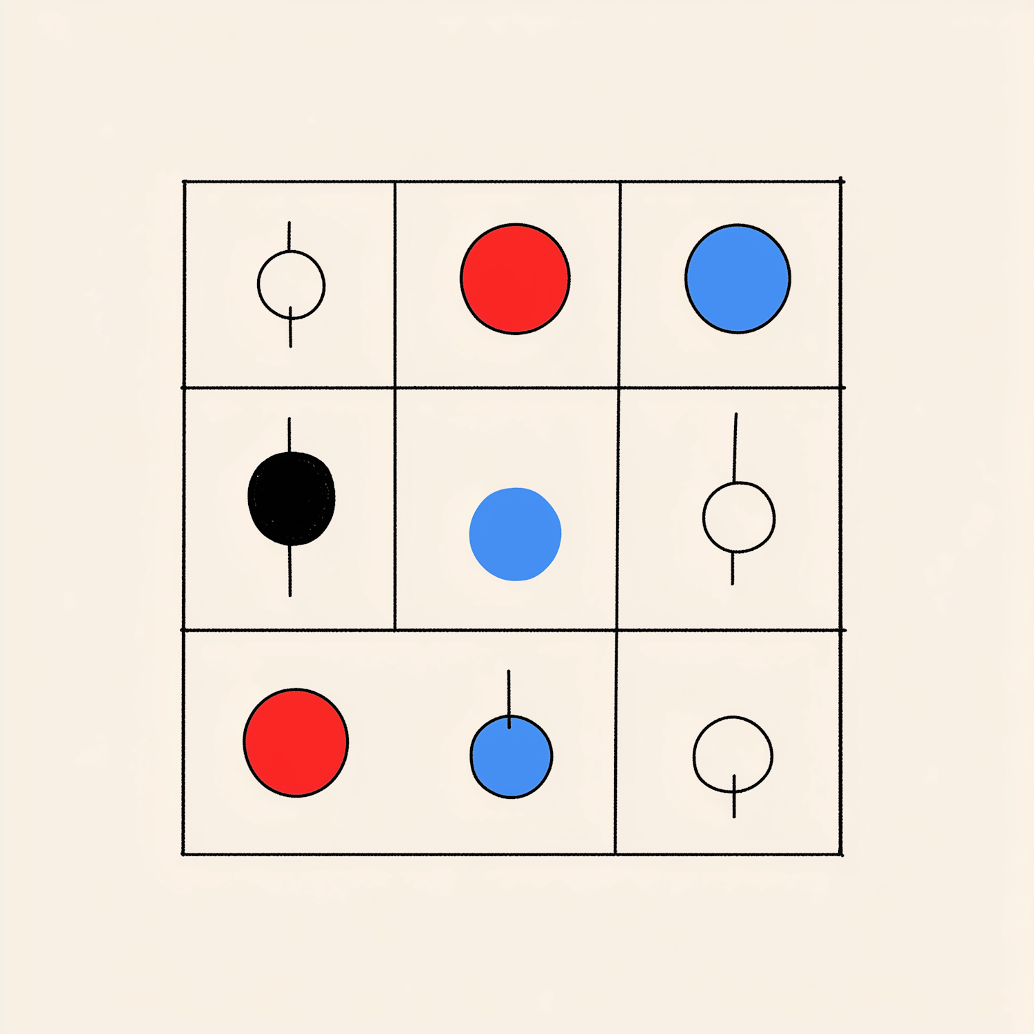 Minimalist 3x3 grid illustration with colorful circles, resembling a tic-tac-toe board. Features red, blue, black, and white circles.