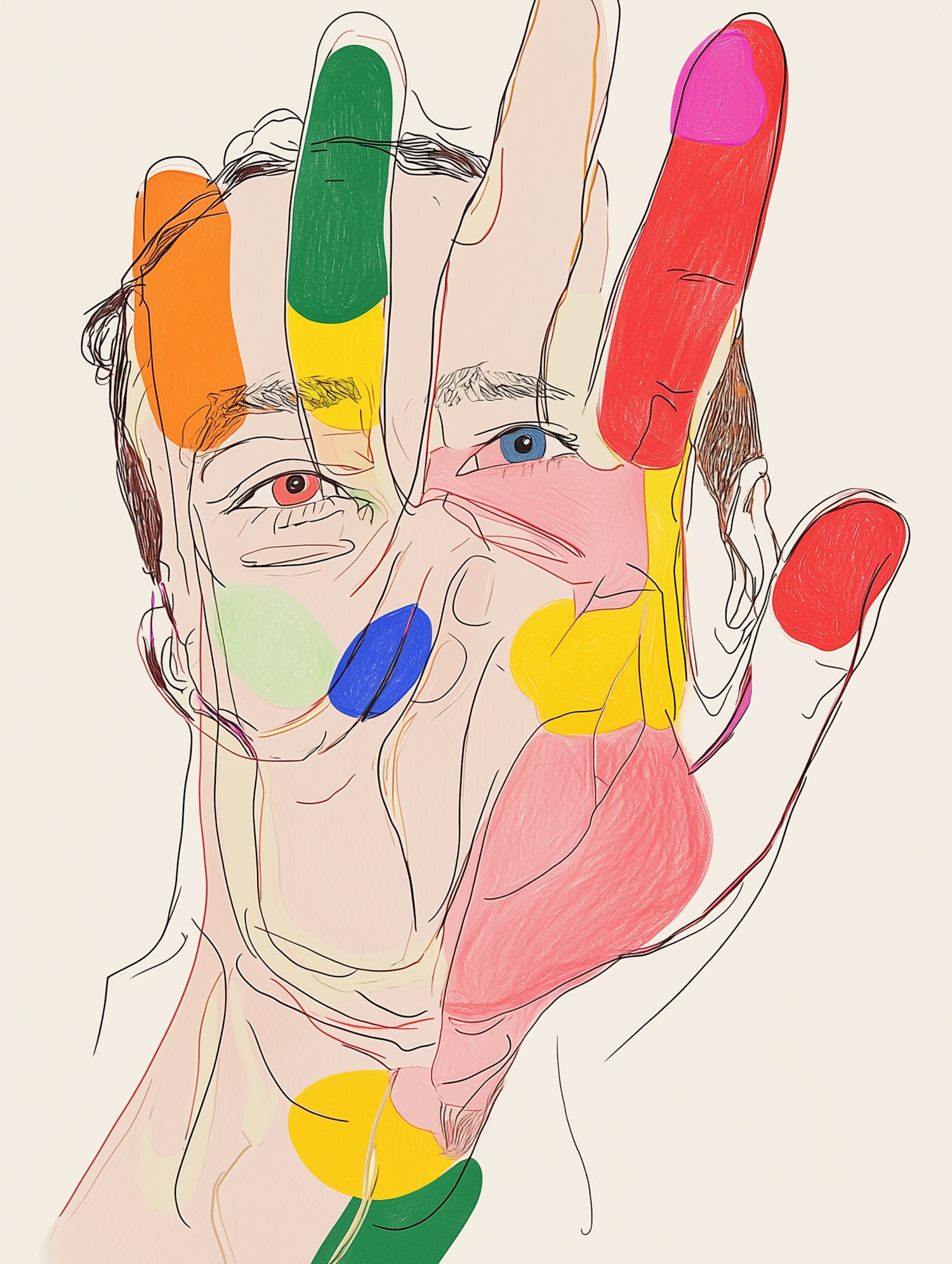 Abstract illustration of a face obscured by a colorful hand, blending realism and vibrant colors for a striking visual effect.