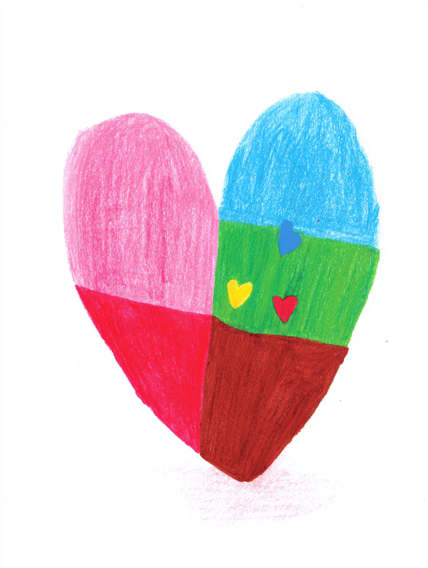 A vibrant hand-drawn heart with colorful sections and small hearts, showcasing a playful and creative design on a white background.