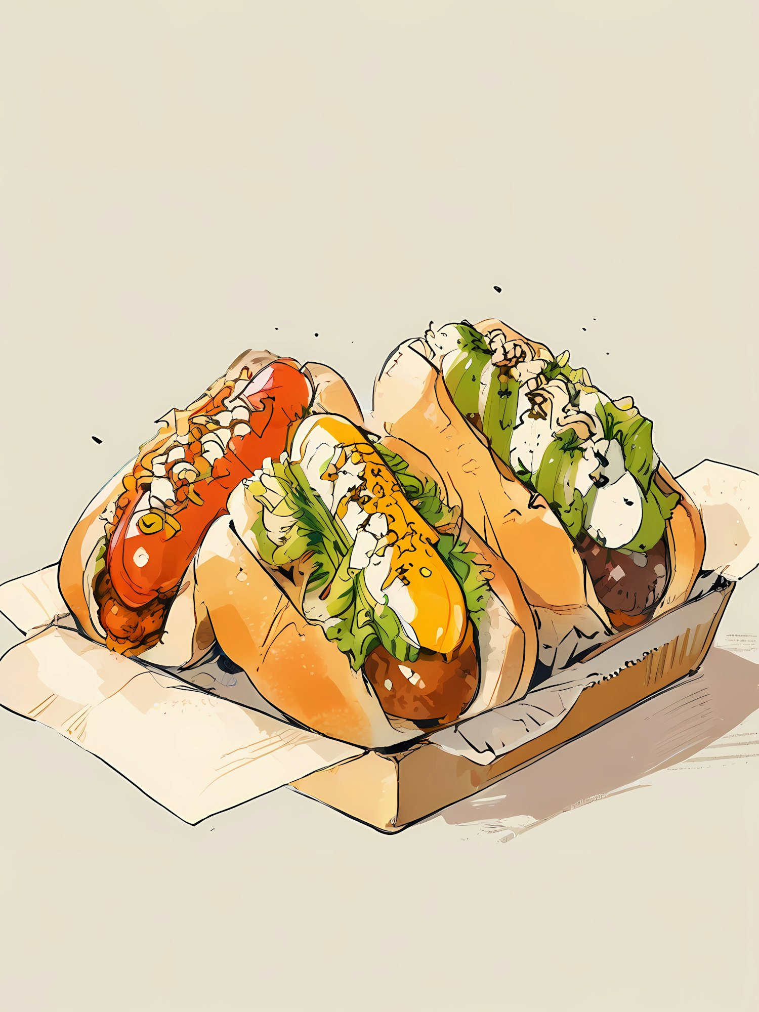 Illustration of three hot dogs with colorful toppings in a cardboard tray on a light background.
