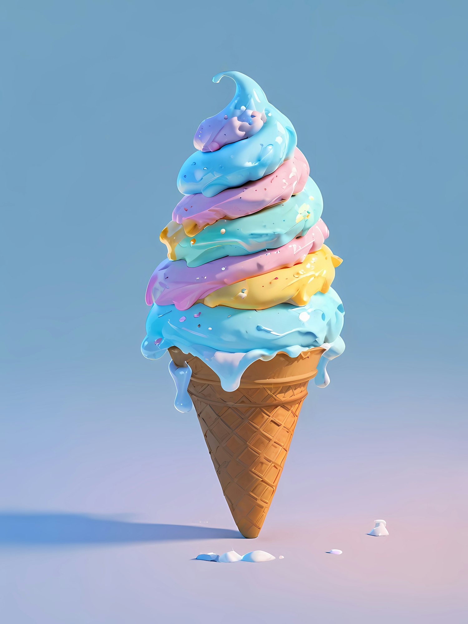 Whimsical 3D ice cream cone with pastel swirls and a glossy texture, set against a dreamy blue gradient background.