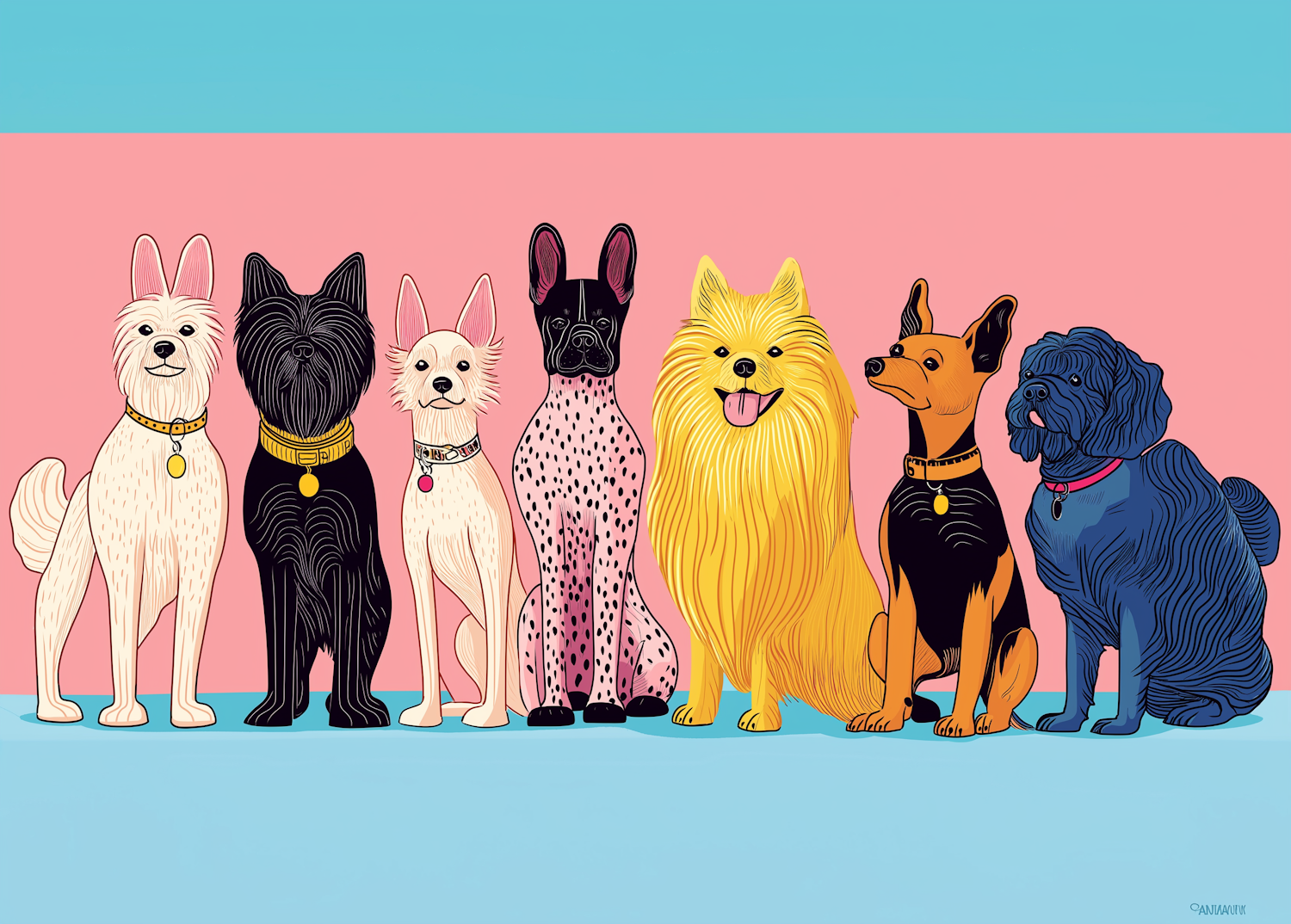 Colorful illustration of seven diverse dogs sitting in a row against a pink and blue background, showcasing various breeds and styles.