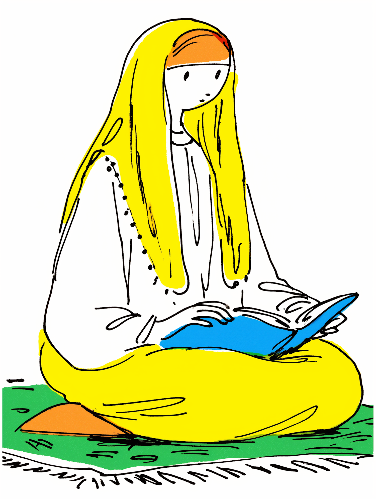 Minimalist illustration of a person in yellow attire reading a blue book on a green mat, with a serene expression.