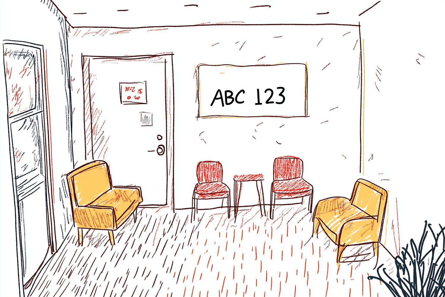 Minimalist waiting room with yellow armchairs, red chairs, and 'ABC 123' sign. Cozy seating and warm wood flooring.