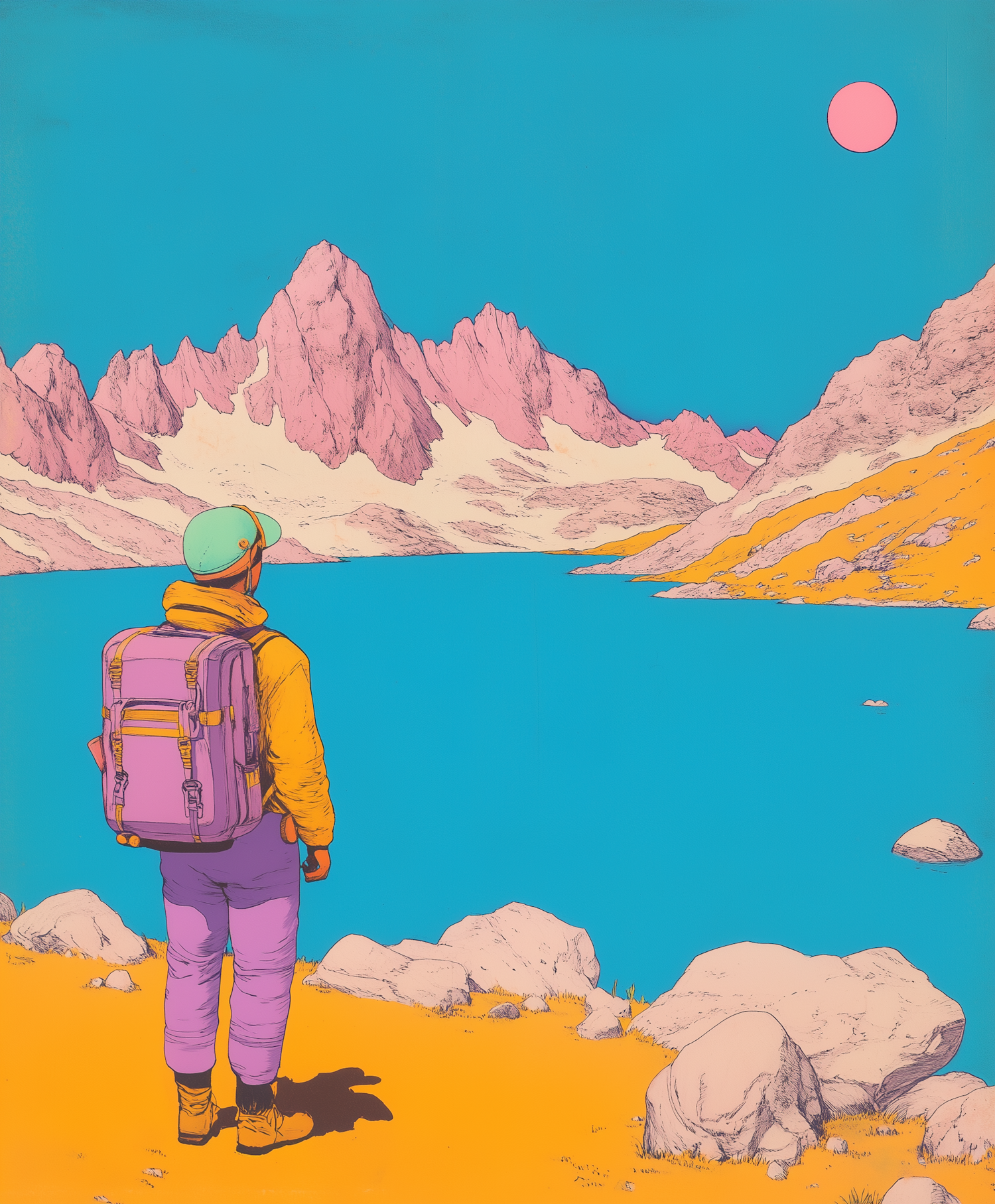 Vibrant illustration of a hiker by a turquoise lake, surrounded by pink mountains and a pink sun, in a surreal, colorful landscape.