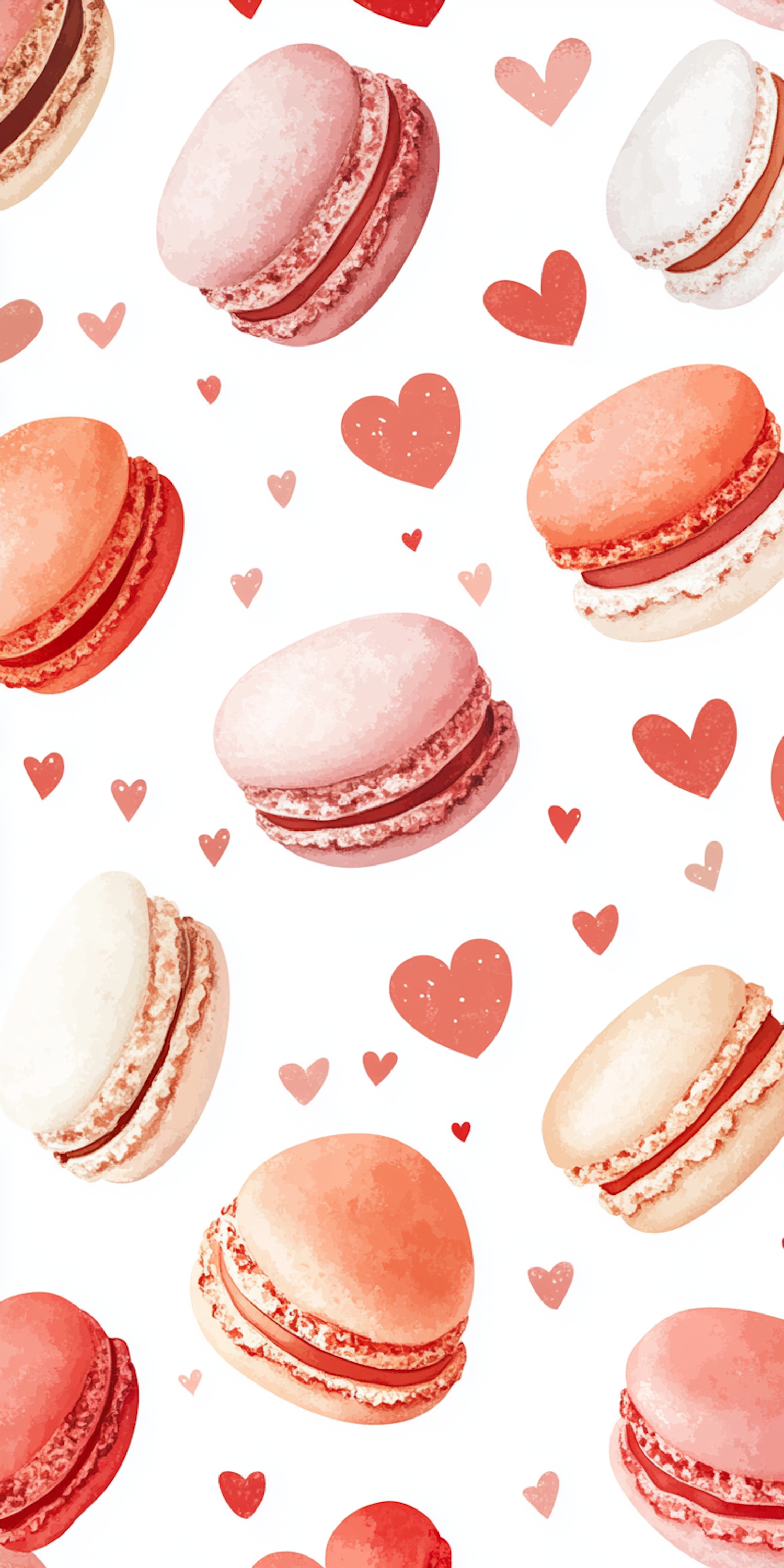 Colorful macarons and hearts pattern on a white background, featuring pink, red, and orange hues for a playful and sweet design.