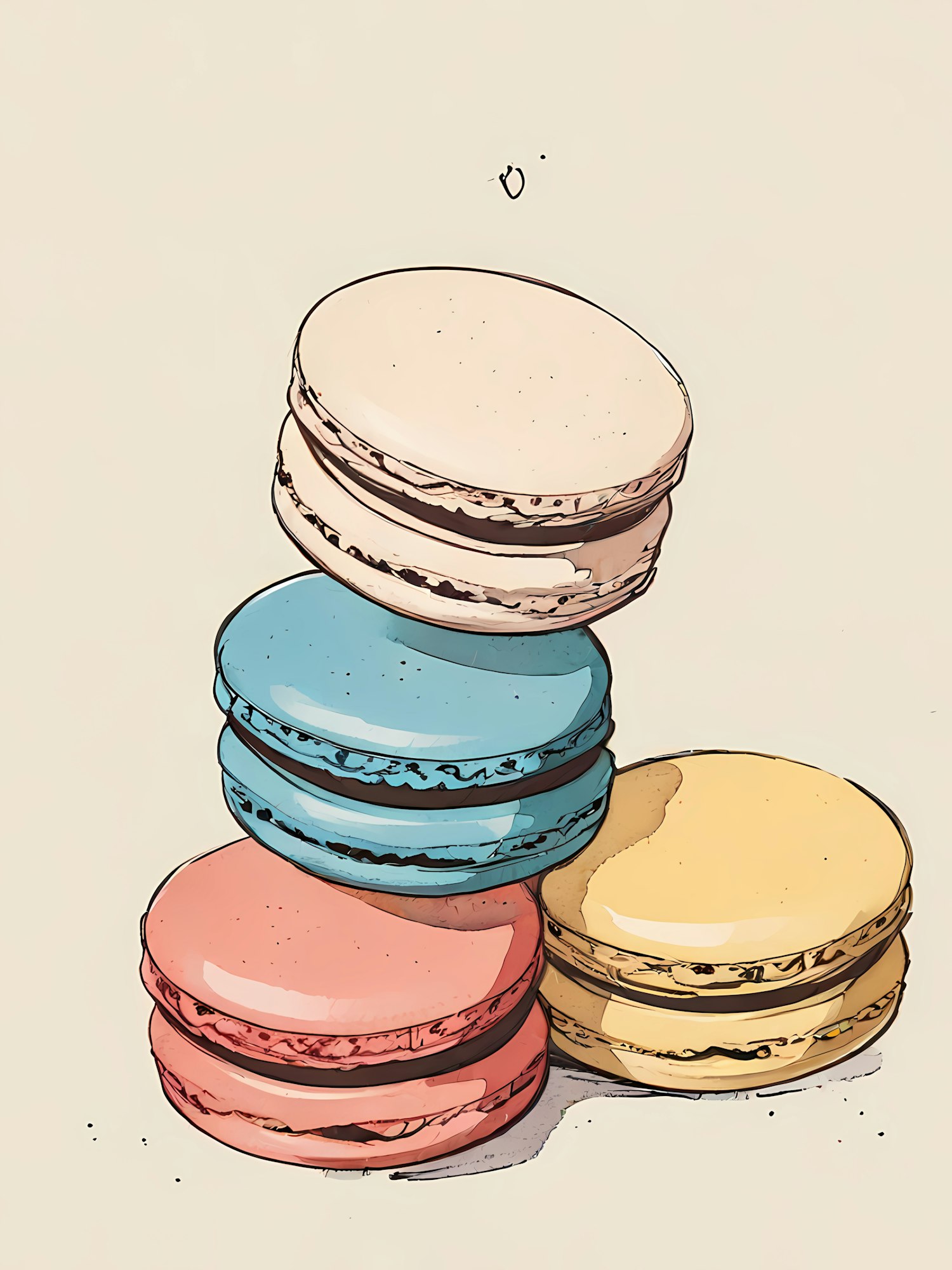 Colorful illustration of stacked macarons in pastel shades: cream, blue, pink, and yellow, on a simple off-white background.