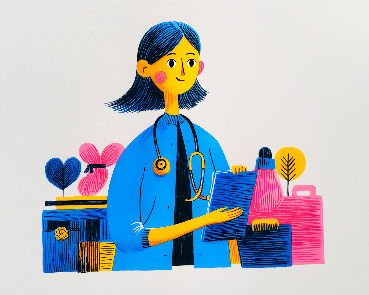 Bright and cheerful illustration of a medical professional with a stethoscope, surrounded by colorful objects and a clipboard in hand.