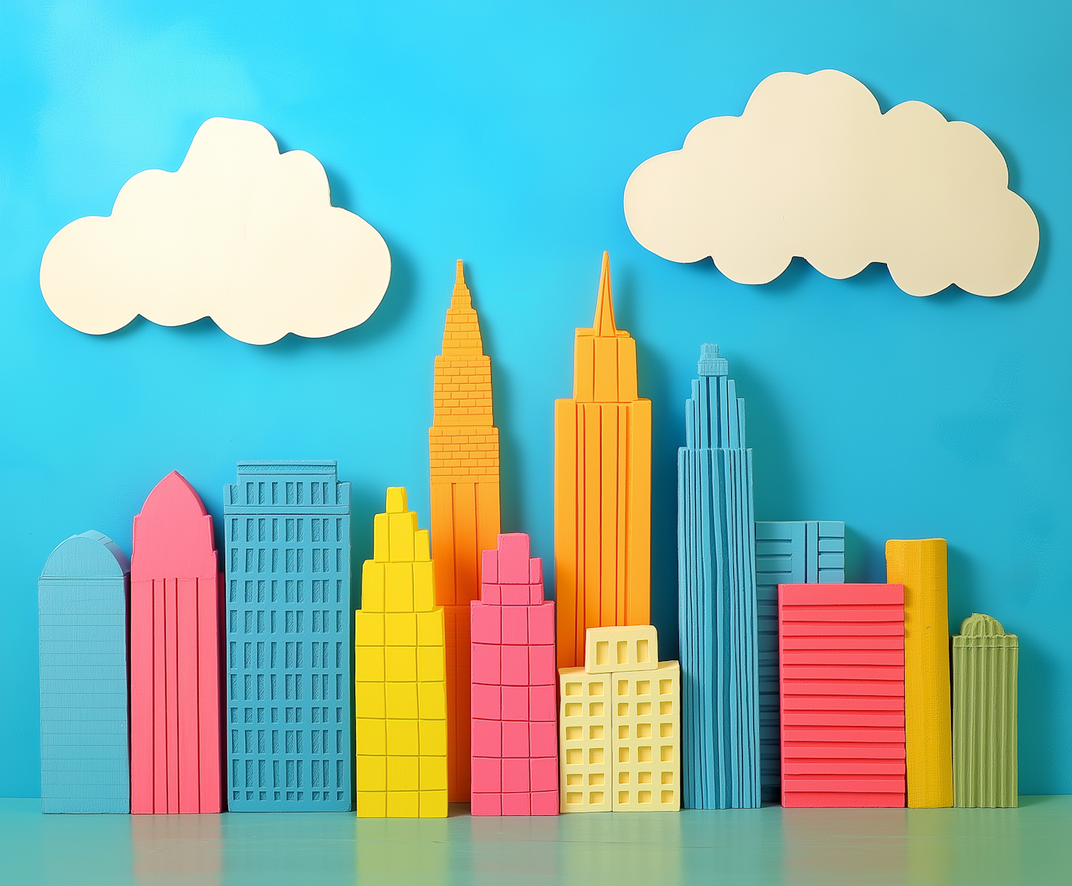Colorful paper cutout cityscape with vibrant buildings and fluffy clouds on a bright blue background.