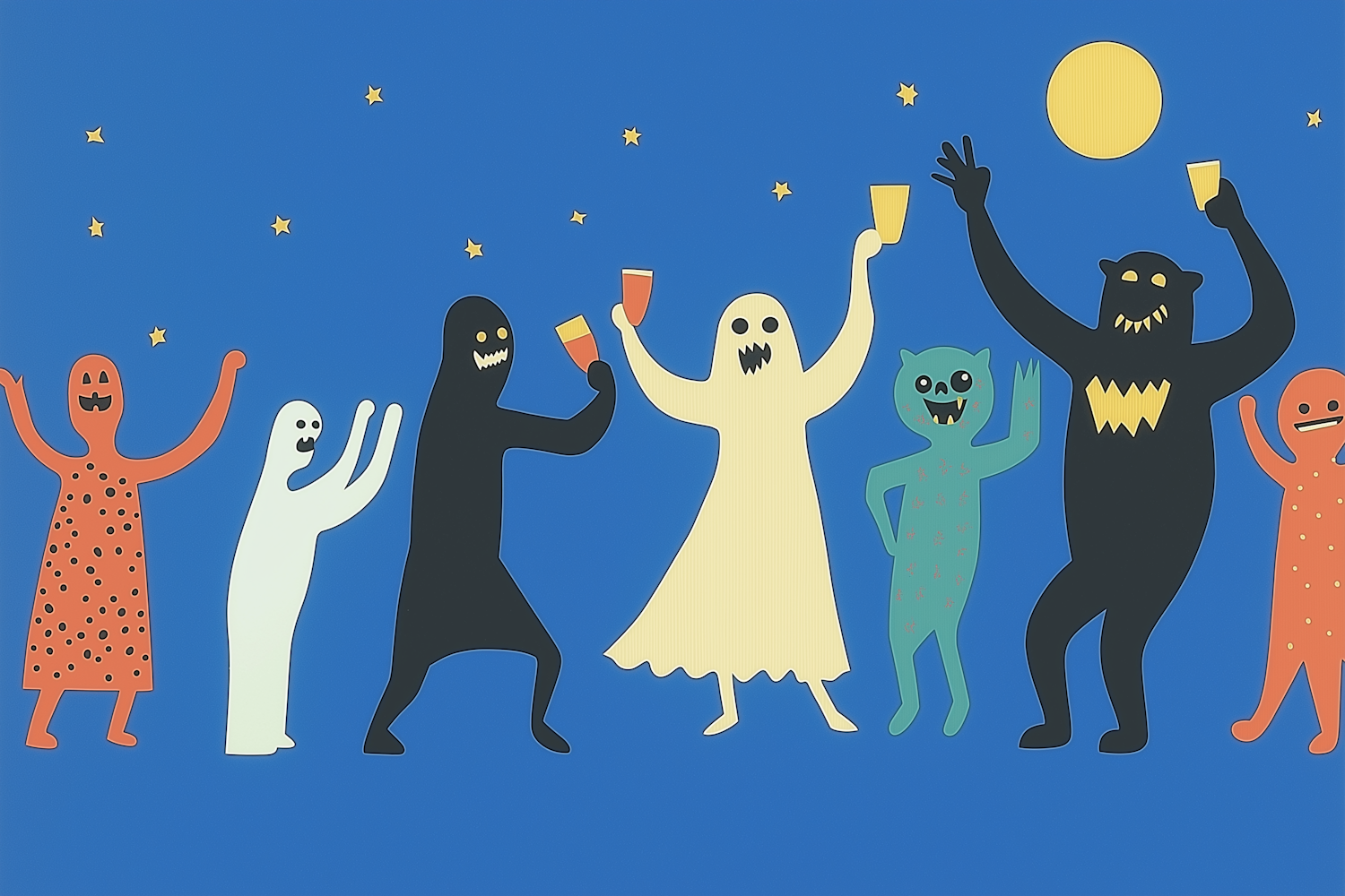 Colorful cartoon monsters and ghosts celebrate under a starry night sky, holding drinks and dancing joyfully.