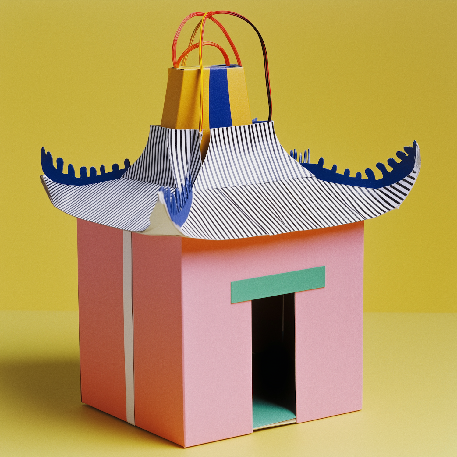 A vibrant paper sculpture with a pagoda-like design, featuring pink, blue, and yellow elements against a bright yellow background.
