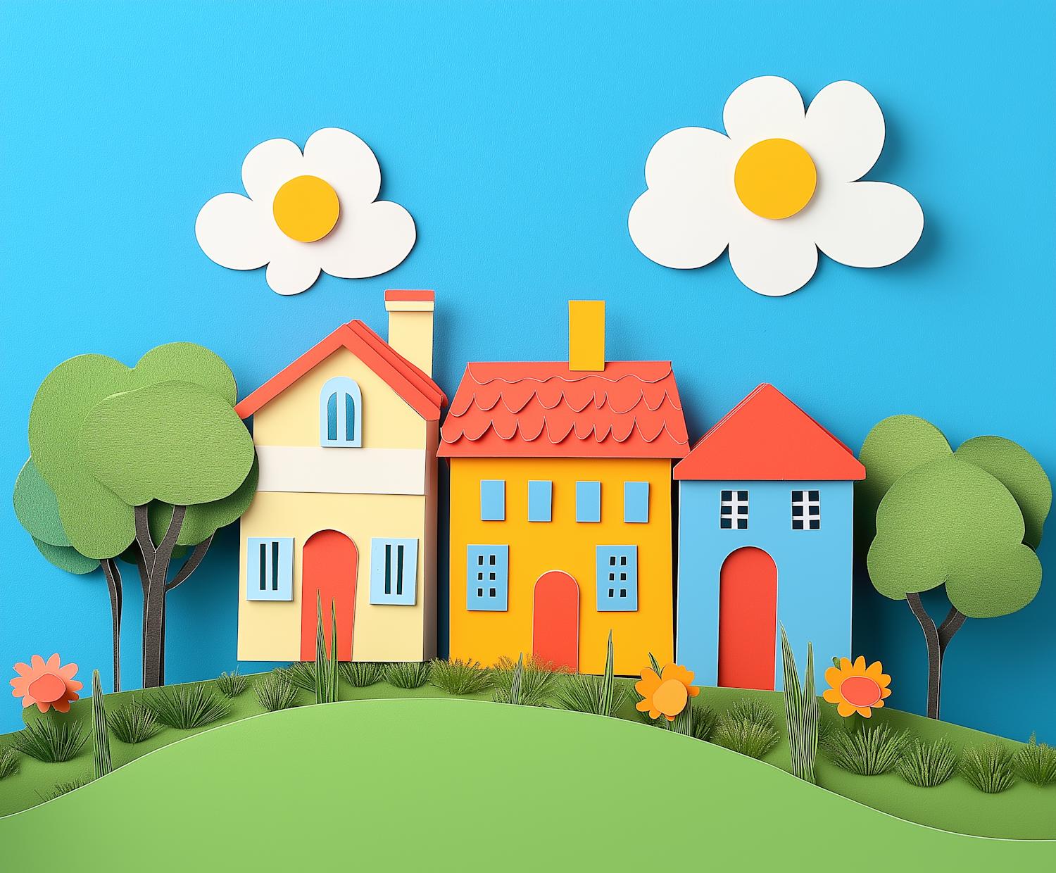 Colorful illustration of three houses on a hill with trees and cartoon clouds in a bright blue sky.