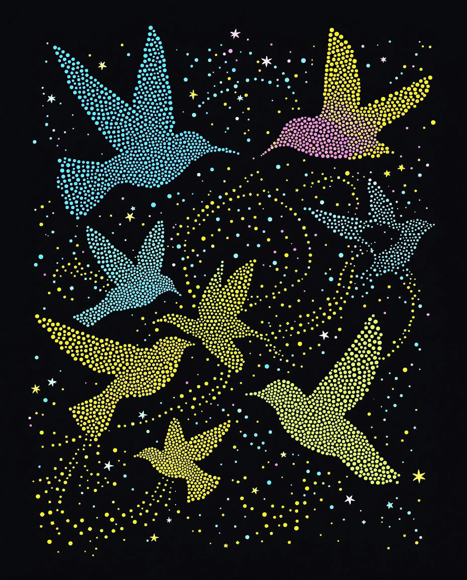Colorful pointillism illustration of small birds in mid-flight, such as hummingbirds, finches, and swallows, rendered in shades of electric blue, fuchsia, canary yellow, and emerald green. Their feathers are made of multicolored dots on a black background, with trailing dotted patterns suggesting movement. Elegant and graphic. No text.