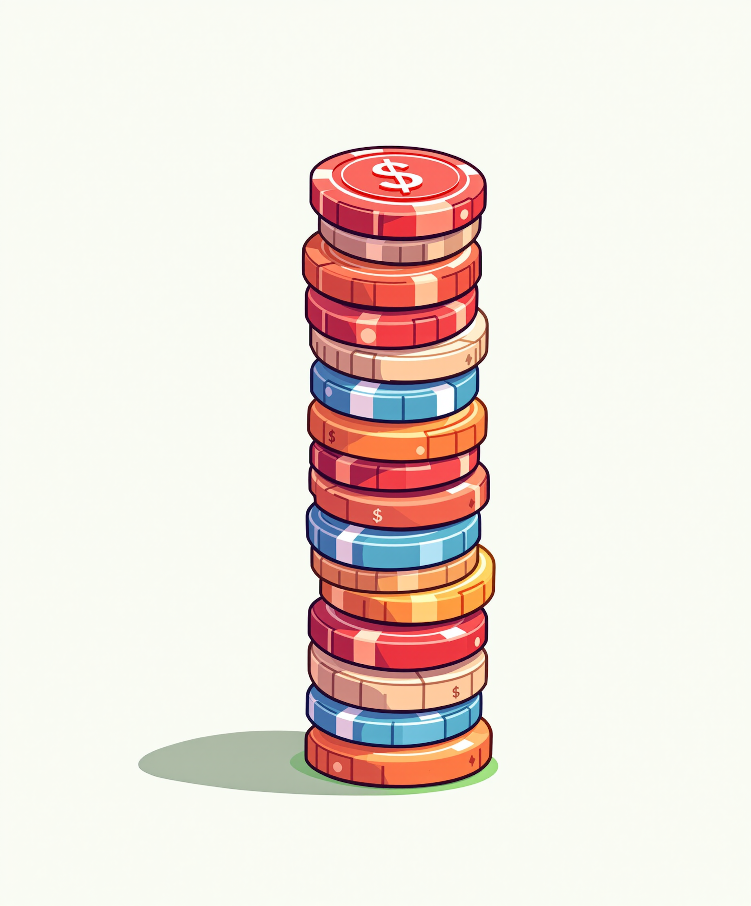A vibrant stack of colorful poker chips with dollar signs, set against a clean white background. Perfect for casino or gaming themes.