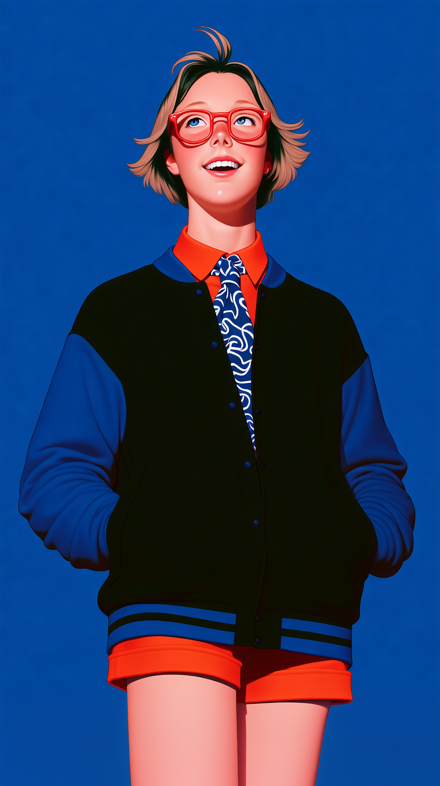 A colorful illustration of a smiling person in a varsity jacket and bright attire against a solid blue background.
