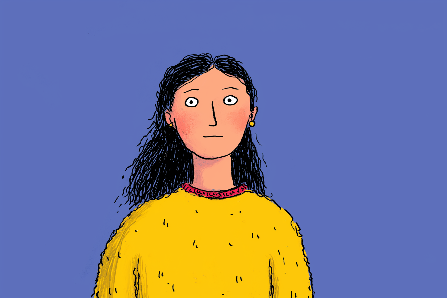 A vibrant illustration of a person with black hair, a yellow sweater, and a blue background, showcasing a simple and colorful art style.
