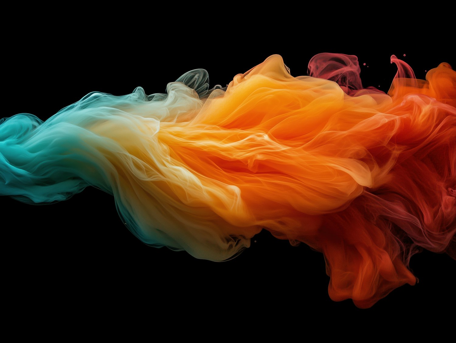 Swirling clouds of teal, yellow, orange, and red smoke on a black background, creating a vibrant and dynamic abstract gradient.