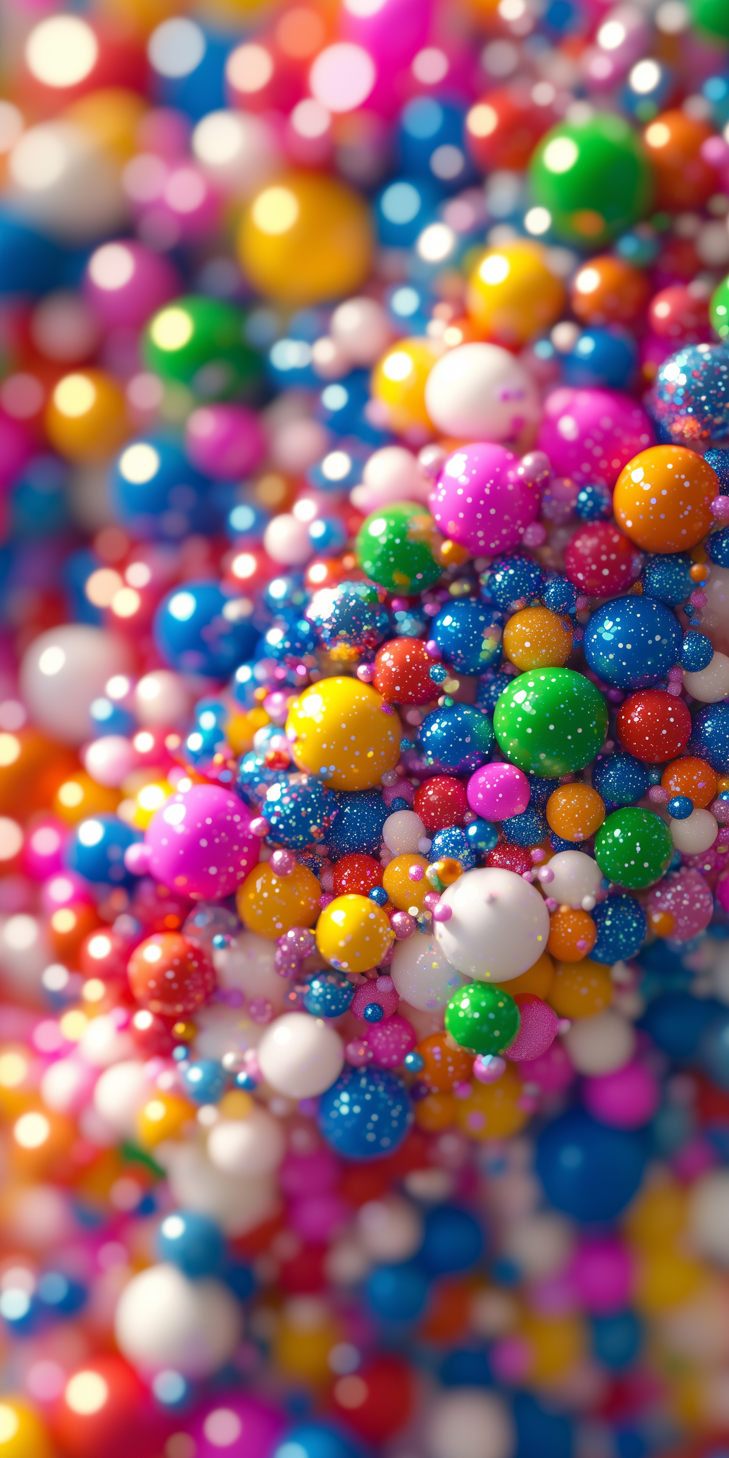 A vibrant mix of colorful spheres with glittery textures, creating a playful and festive vibe. Perfect for candy or decoration themes.
