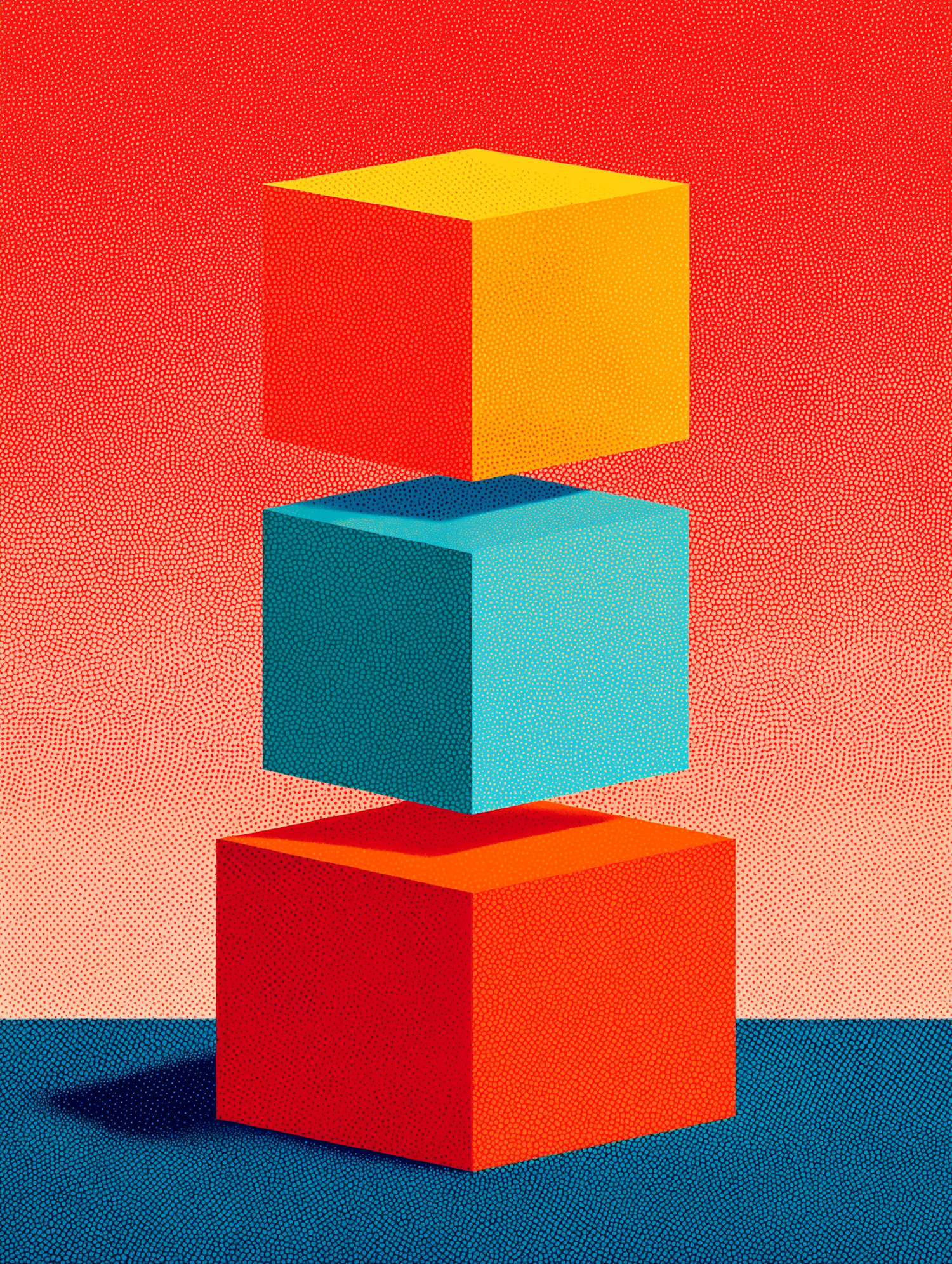 A vibrant illustration of three stacked cubes in yellow, blue, and red, set against a gradient red-pink background with a dotted texture.