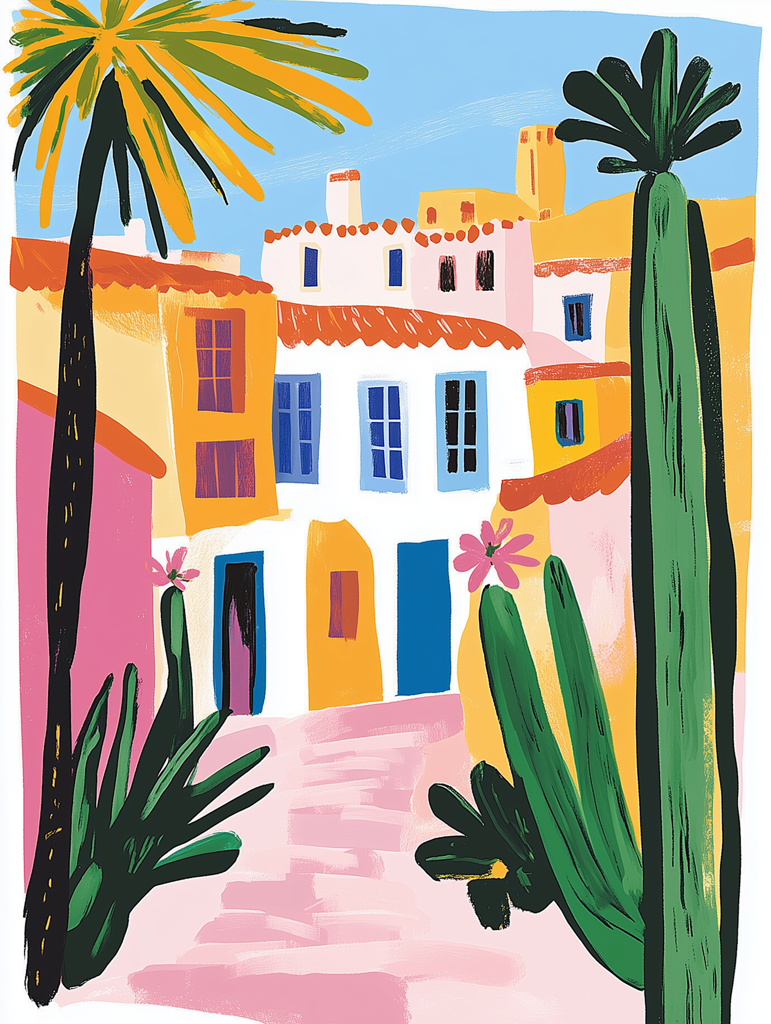Colorful Mediterranean village illustration with palm trees, cacti, and vibrant buildings under a clear blue sky.