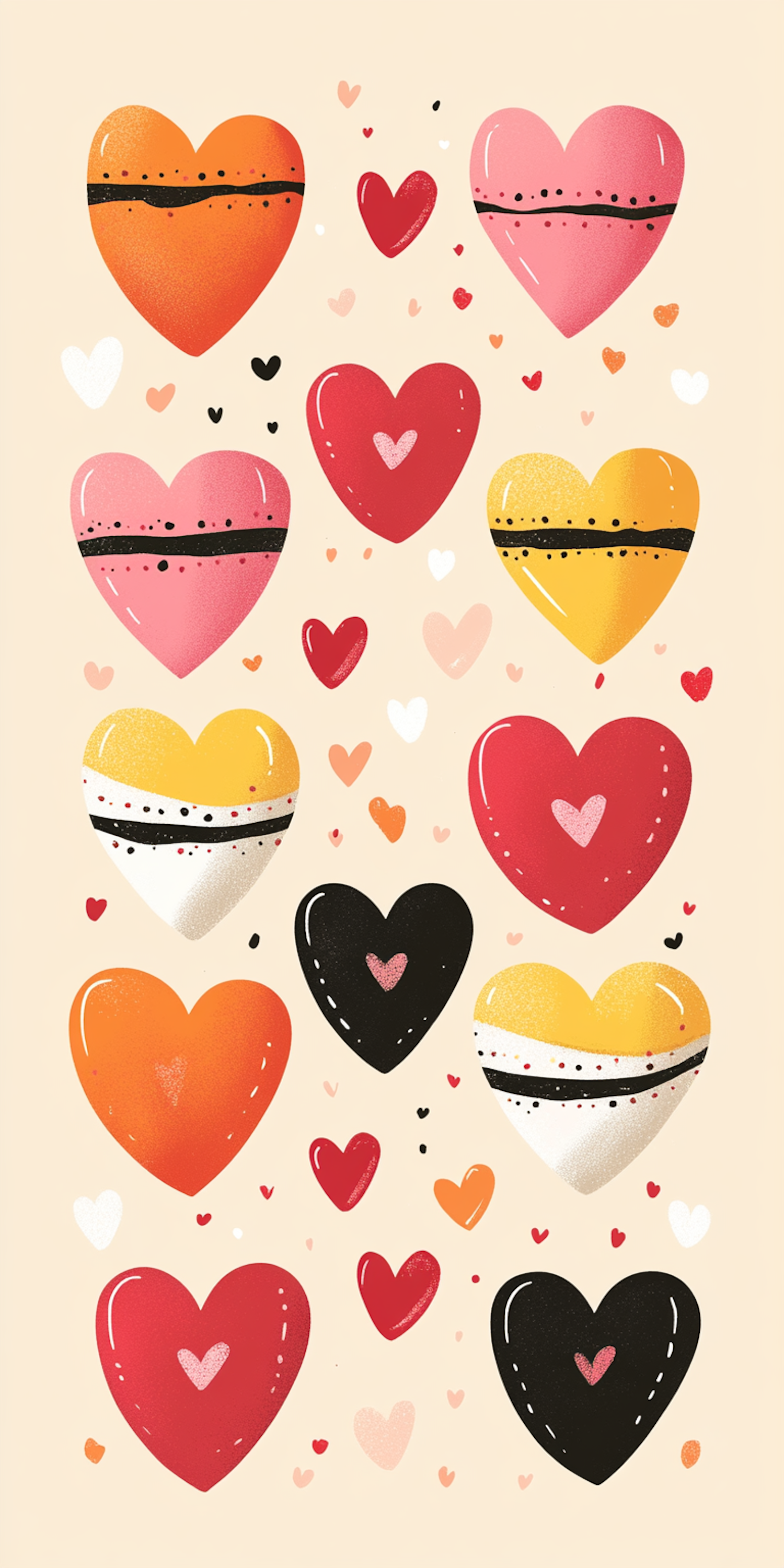 Colorful heart illustration with vibrant patterns on a beige background, featuring red, pink, yellow, black, and orange hearts.
