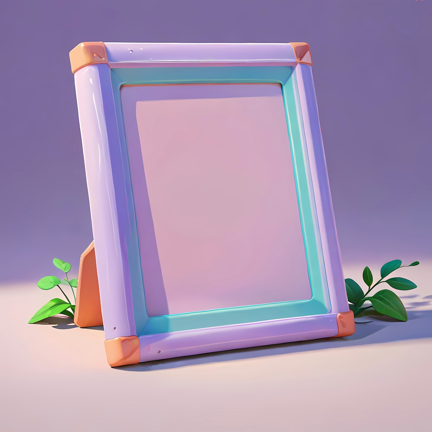 Stylized pastel picture frame with teal and peach accents against a purple background, featuring small green leaves.