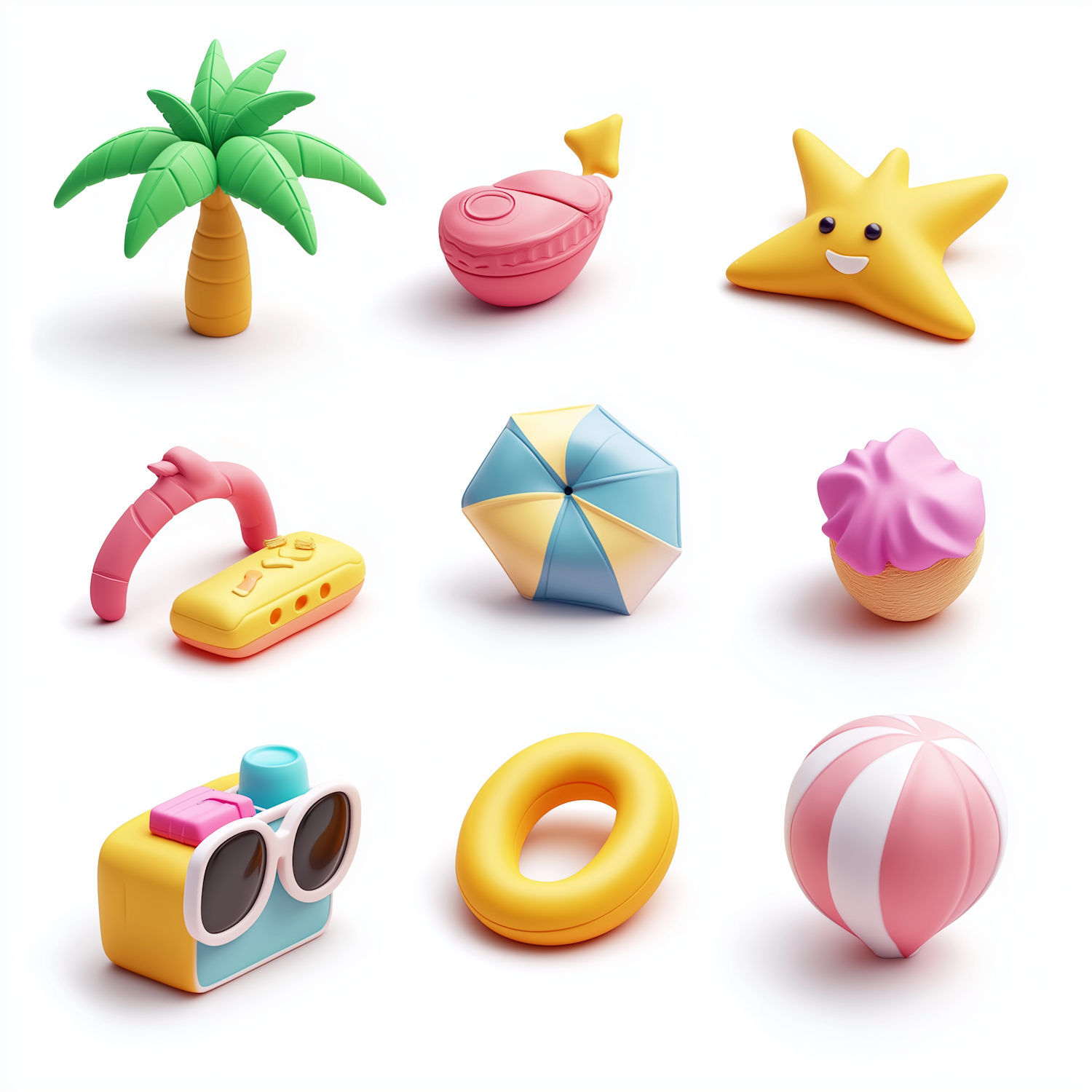 Playful summer-themed illustration with palm trees, beach balls, ice cream, and more in vibrant colors and a cartoonish style.
